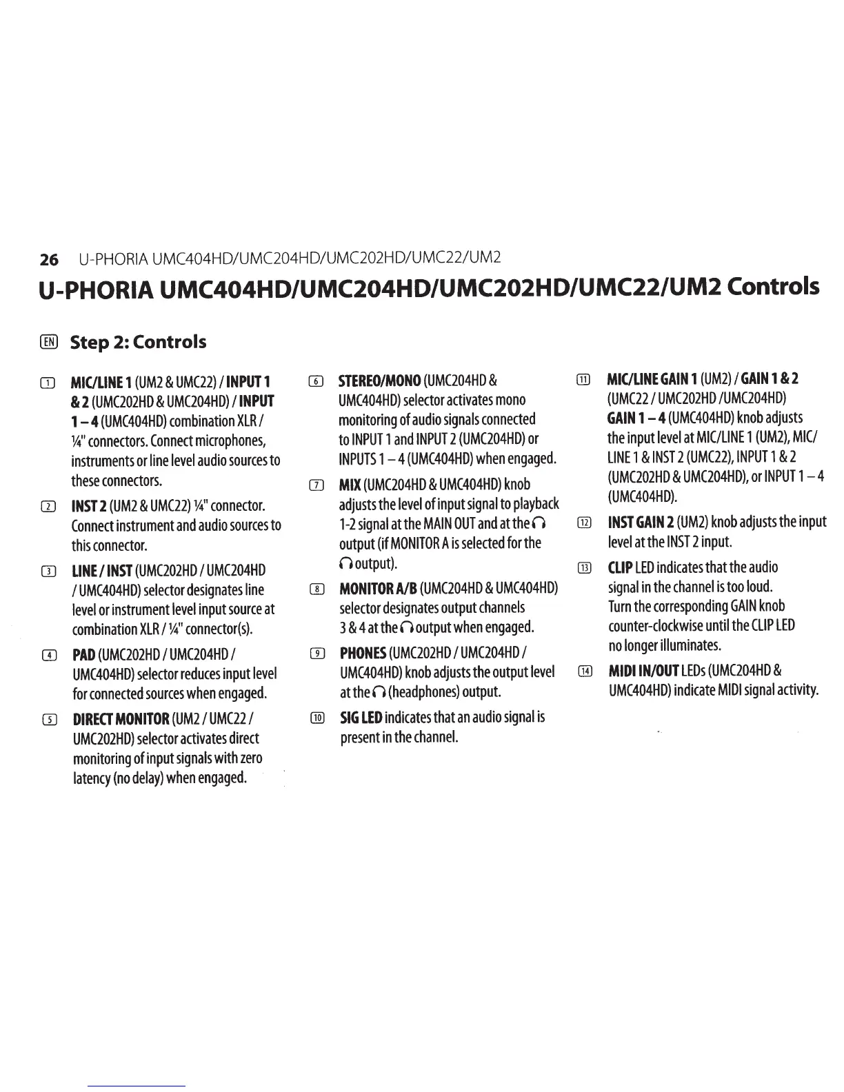 U-PHORIA UMC404HD/UMC204HD/UMC202HD/UMC22/UM2 Controls