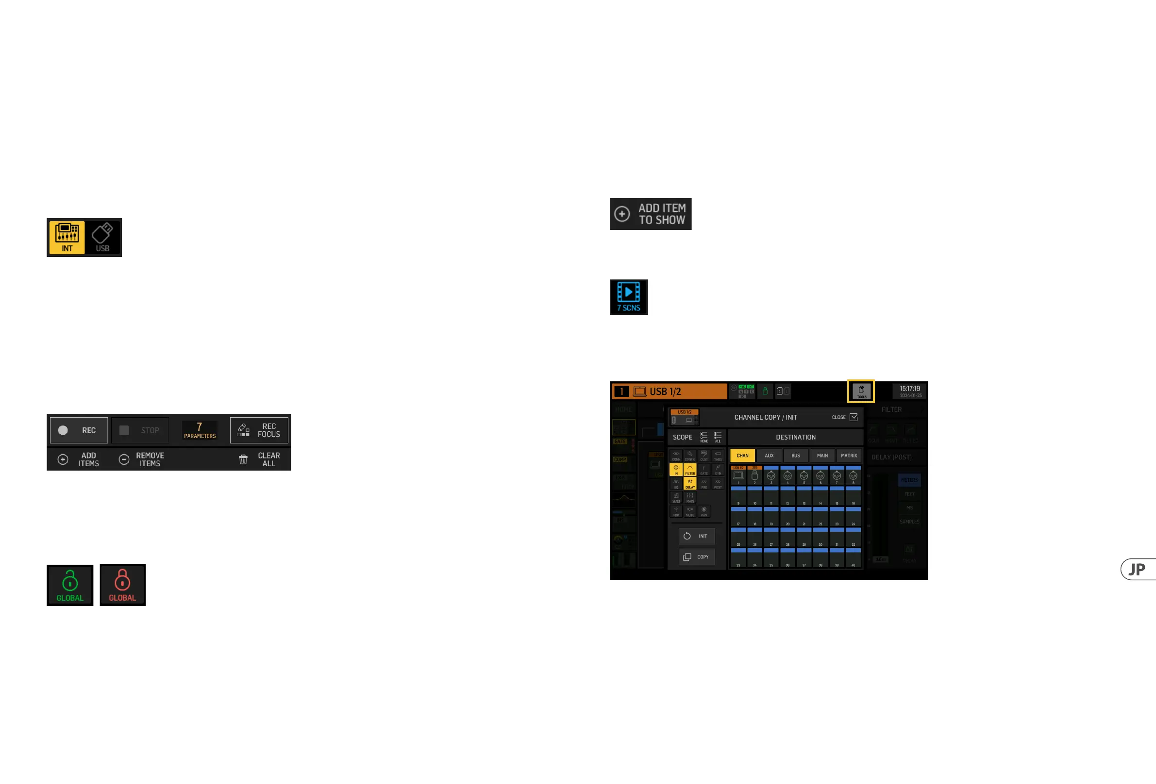 スナップ ショット、スニペット、クリップ、FX 設 定 、チ ャ ネ ル 設 定 は 、グ ル ー プ 化 し て Shows と し て 保 存 で き ま す 。こ れ を 行 う に は 、SHOW