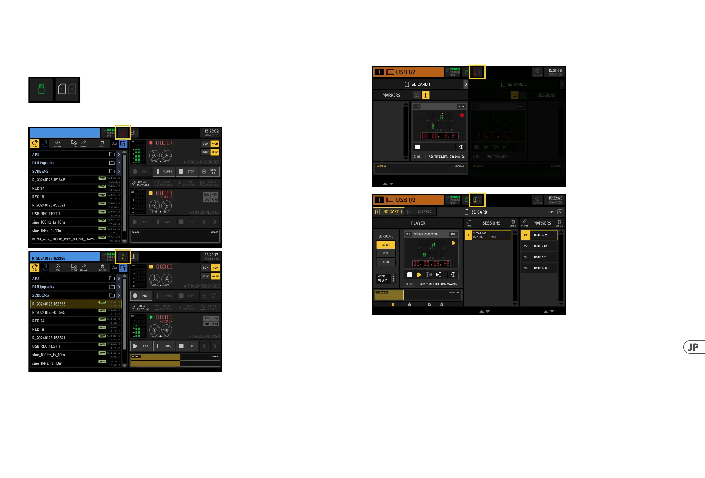 USB と SD のレコーダーとそれに対応するプレーヤーは、メインディスプレイの上部のアイコンを介してアクセスすることができます。