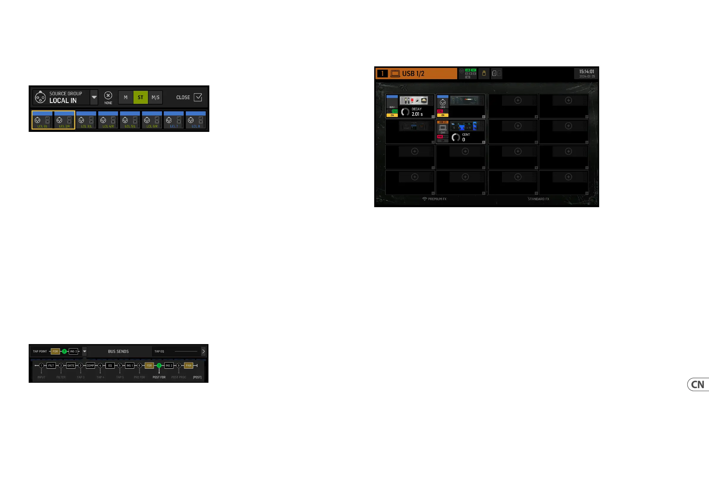八个 PREMIUM FX 插槽可以容纳每个设备 (FX1-8, STD 和 CH 类别)。 STANDARD FX 插槽可以容纳 STD 和 CH 效果类别。 请注意, CH 类别包含四个通
