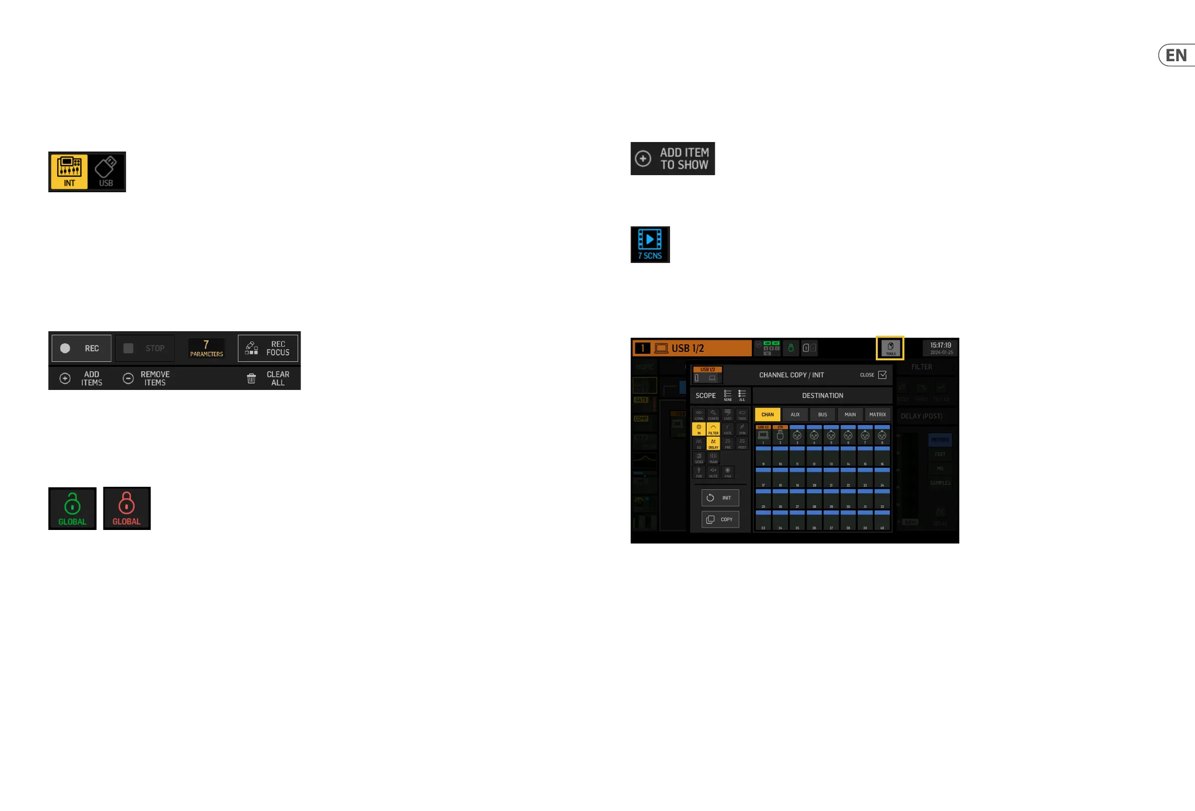 The SAVE button saves all the console’s settings. SAVE+SCOPE allows the user to select specic content to be saved for specic channels. The NONE and ALL buttons