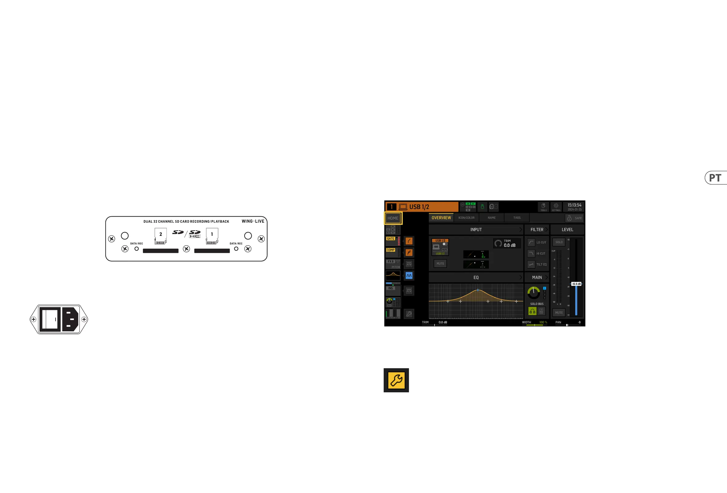 O console WING é enviado com o cartão WING-LIVE instalado, que permite a gravação de até 64 canais de áudio de 48 kHz / 32 bits em um par de cartões SD ou SDHC.