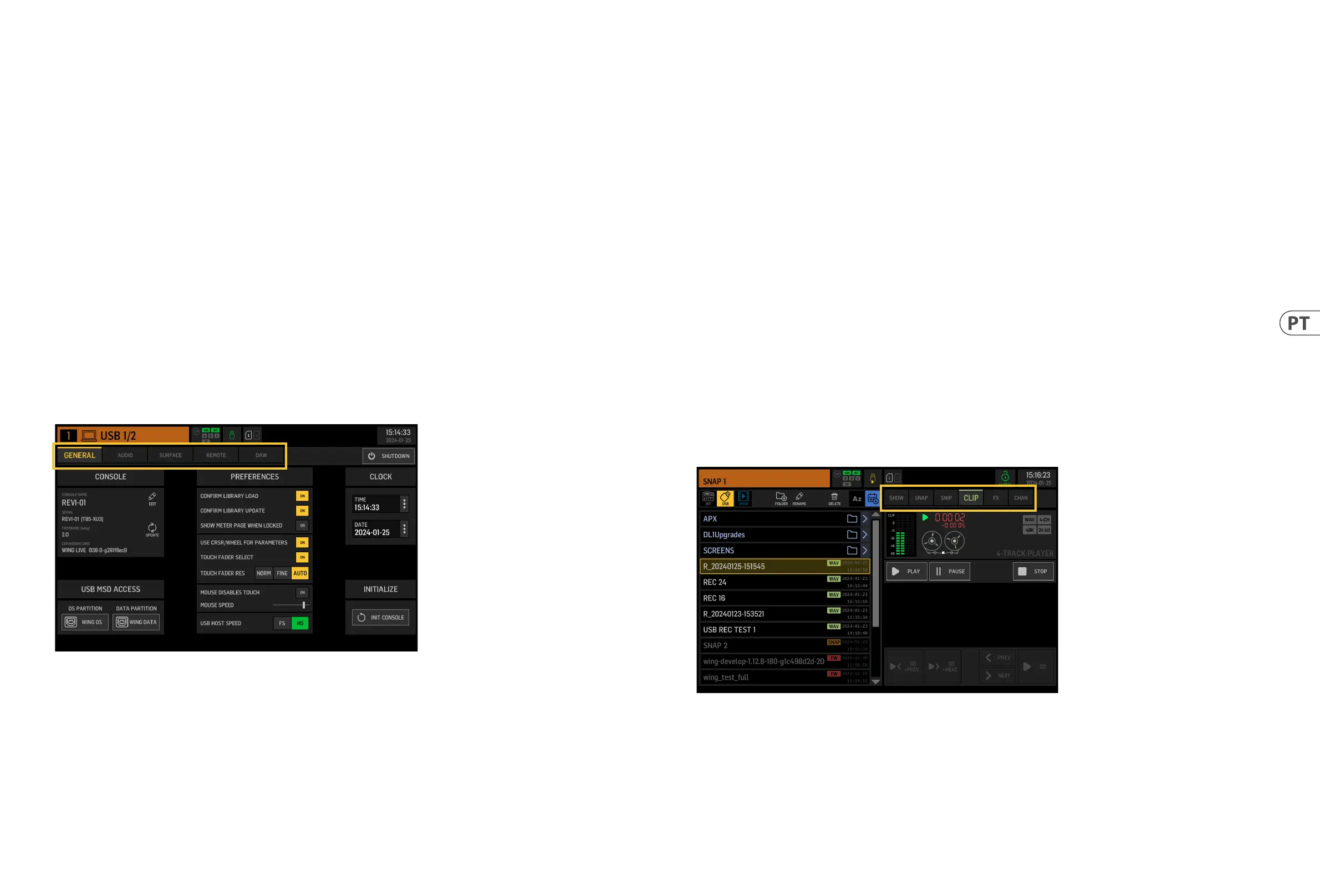 console. Selecione WING DATA para gerenciar os dados do show do console salvos (shows, snips, snaps, presets, clips). Para desconectar o console do computador ou