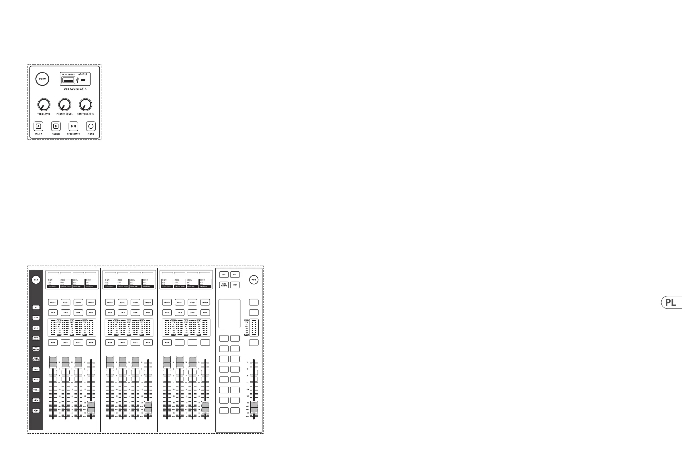 Aby uzyskać dostęp do konguracji banku faderów, naciśnij i przytrzymaj przycisk VIEW. Aby przypisać kanały do wybranego banku, przeciągnij i upuść je z zakładek