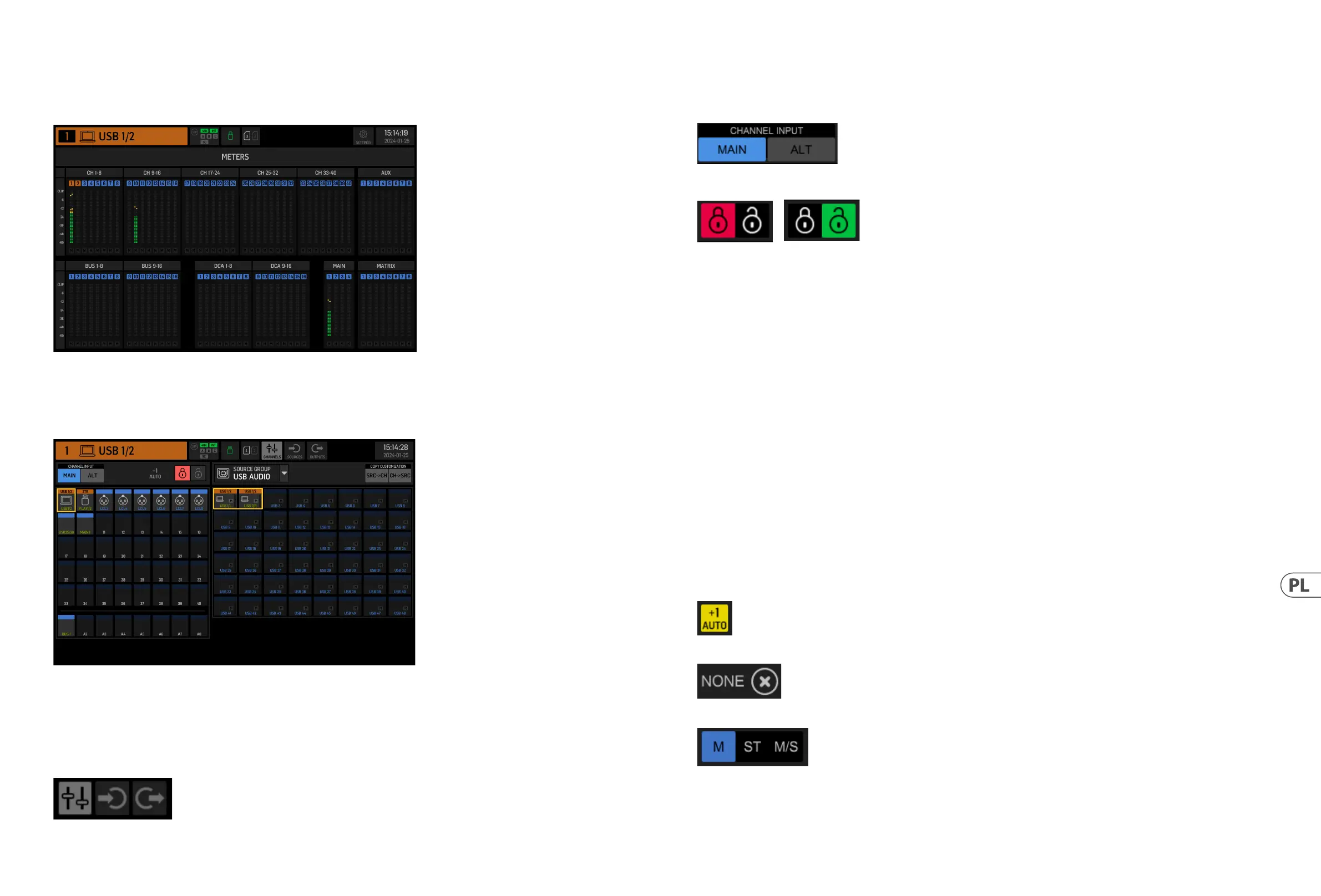 Kongurację mono, stereo lub mid-side każdego kanału można skongurować za pomocą przycisków M, ST i M/S.