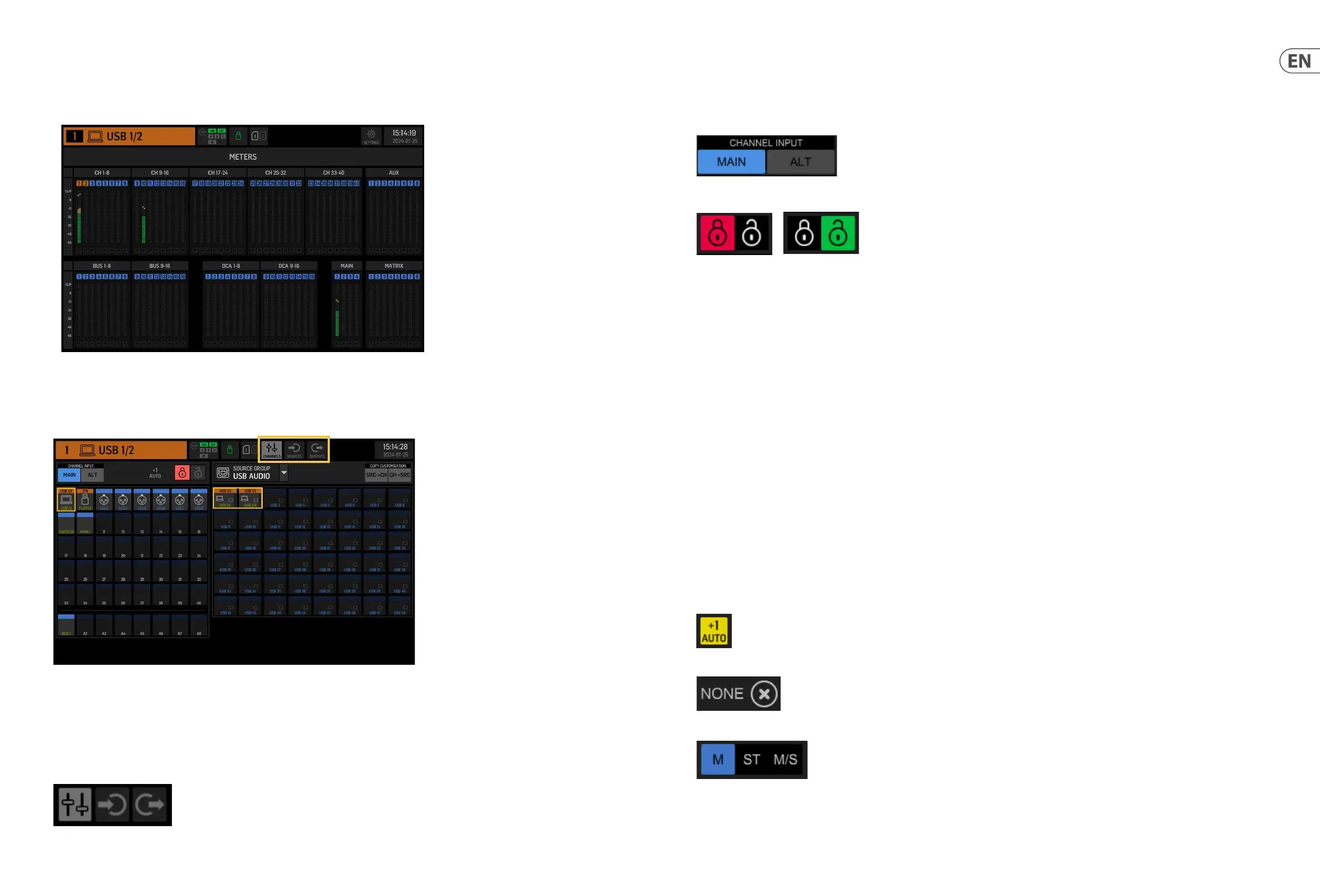 The mono, stereo or mid-side conguration of each channel can be congured via the M, ST and M/S buttons.