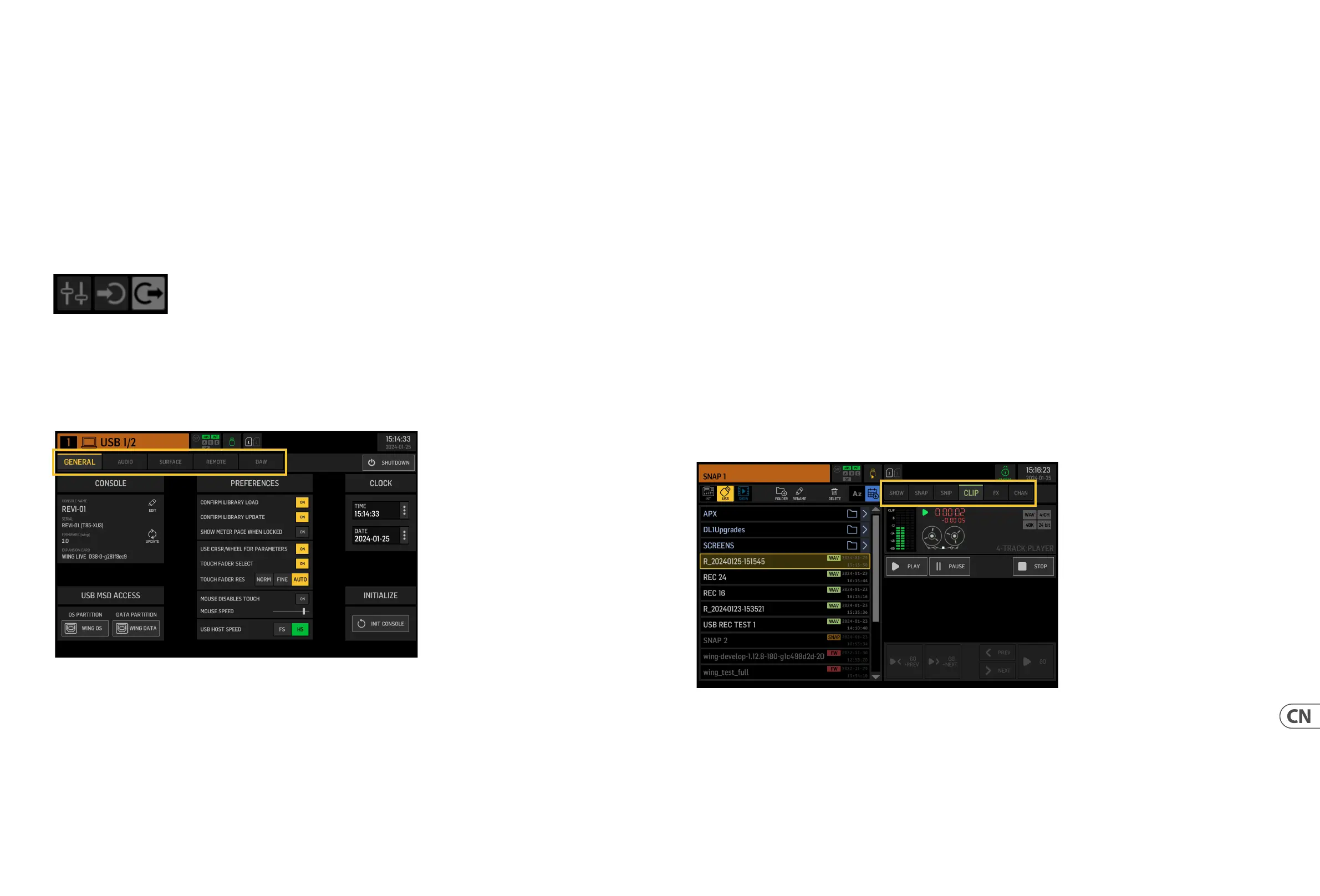 USB MSD ACCESS 控制连接到计算机 via USB 时将显示的内容。 选择 WING OS 在控制台上加载软件更新。 选择 WING DATA 管理保存的控制台演