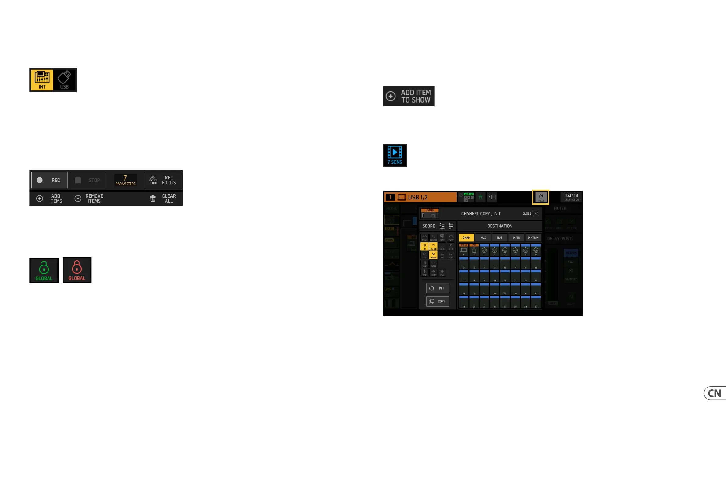 片段可用于回调更精确的设置调整, 如通道条中的特定处理器更改。 要选择将存储在片段中的哪些设置, 点击 REC 按钮并手动调整所需