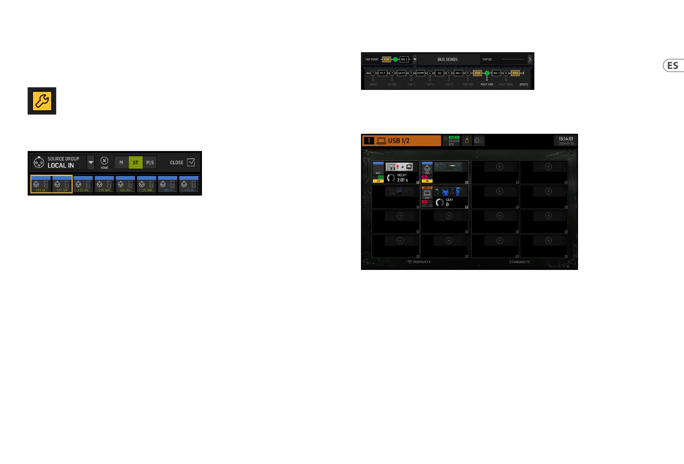 Efectos internos o externos cargados en uno de los 16 espacios de FX se pueden insertar en el canal. La inserción de efectos se puede ubicar antes o después de los