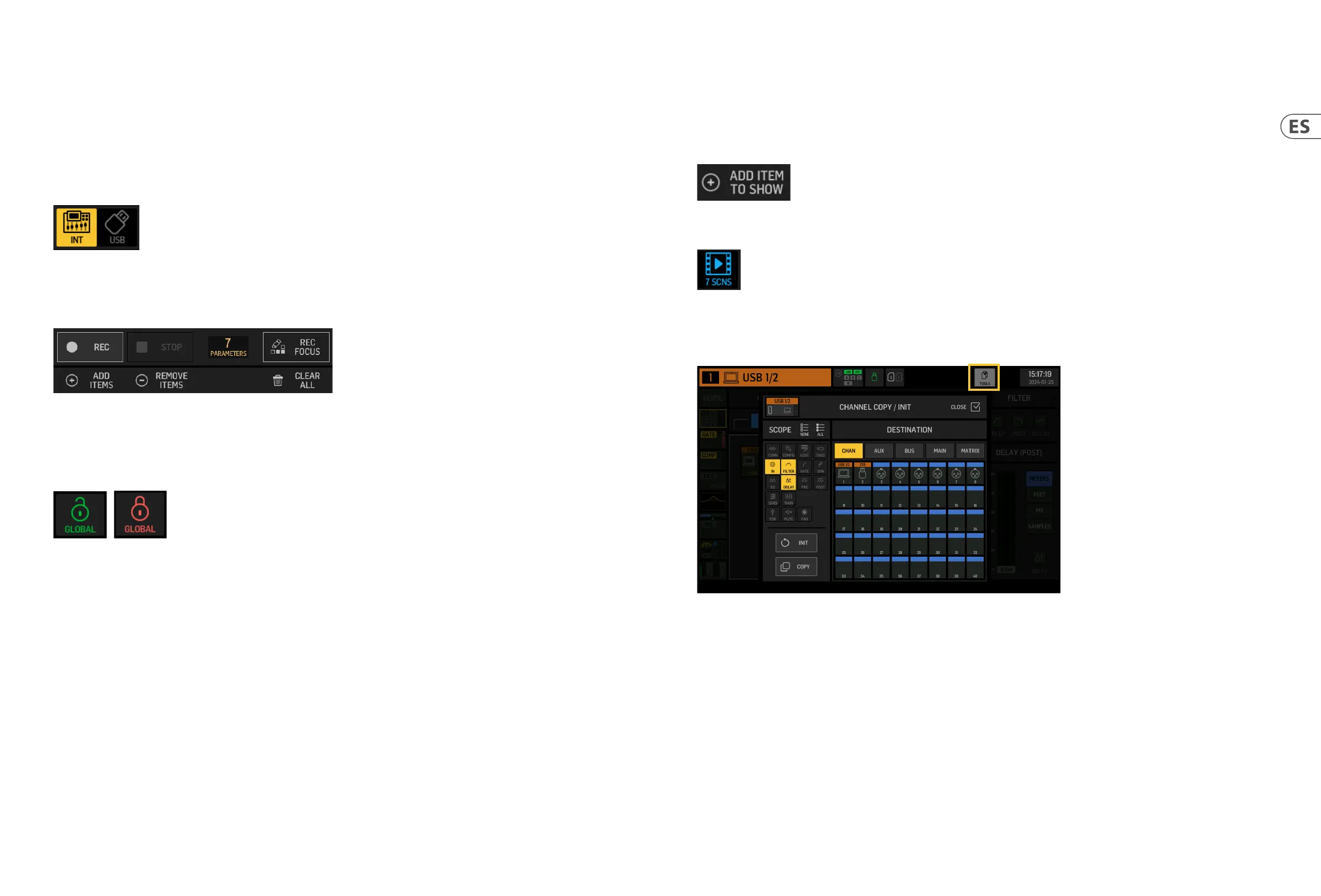 Snapshots, snippets, clips, conguraciones de FX y conguraciones de canal pueden agruparse y guardarse como Shows. Para hacerlo, vaya a la pestaña SHOW y haga