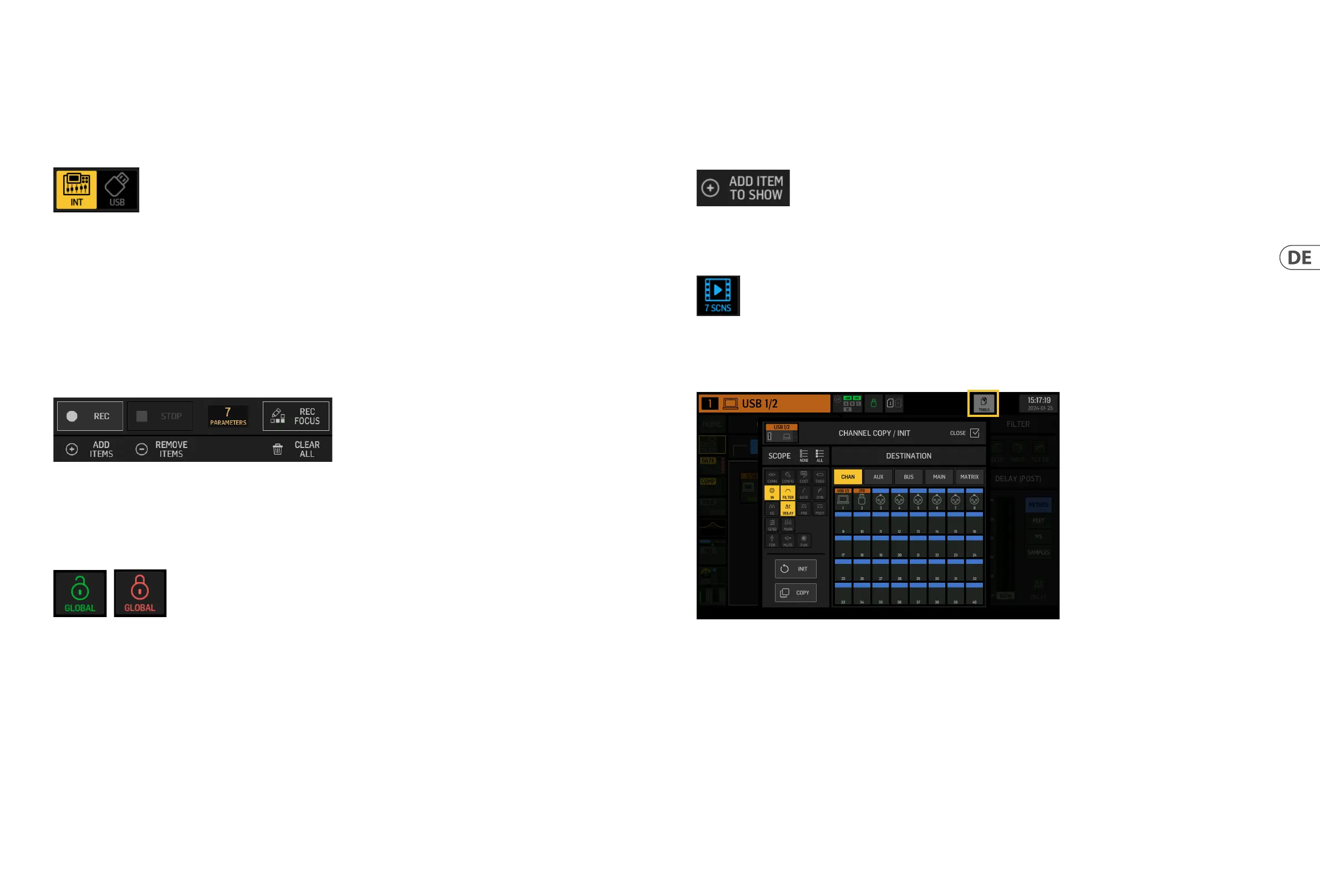 Snapshots, Snippets, Clips, FX-Setups und Kanaleinstellungen können gruppiert und als Shows gespeichert werden. Um dies zu tun, gehen Sie zur SHOW-Registerkarte