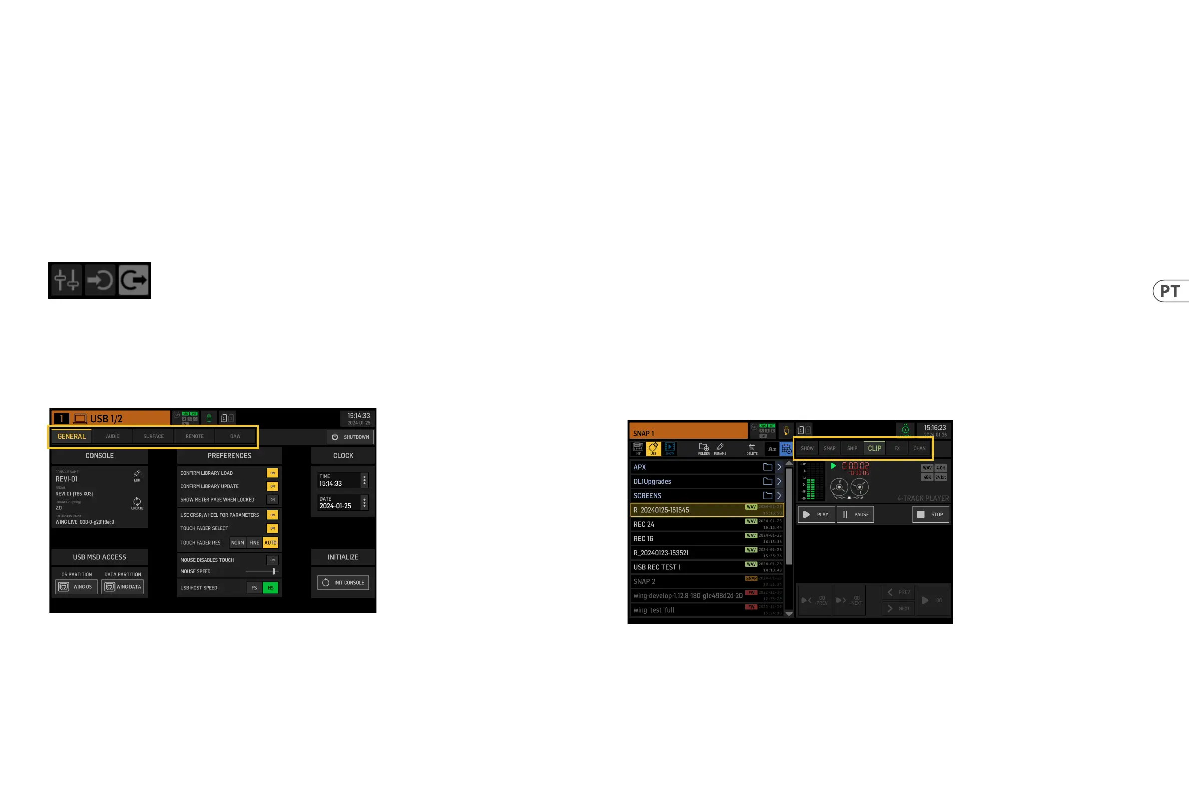 console. Selecione WING DATA para gerenciar os dados do show do console salvos (shows, snips, snaps, presets, clips). Para desconectar o console do computador ou