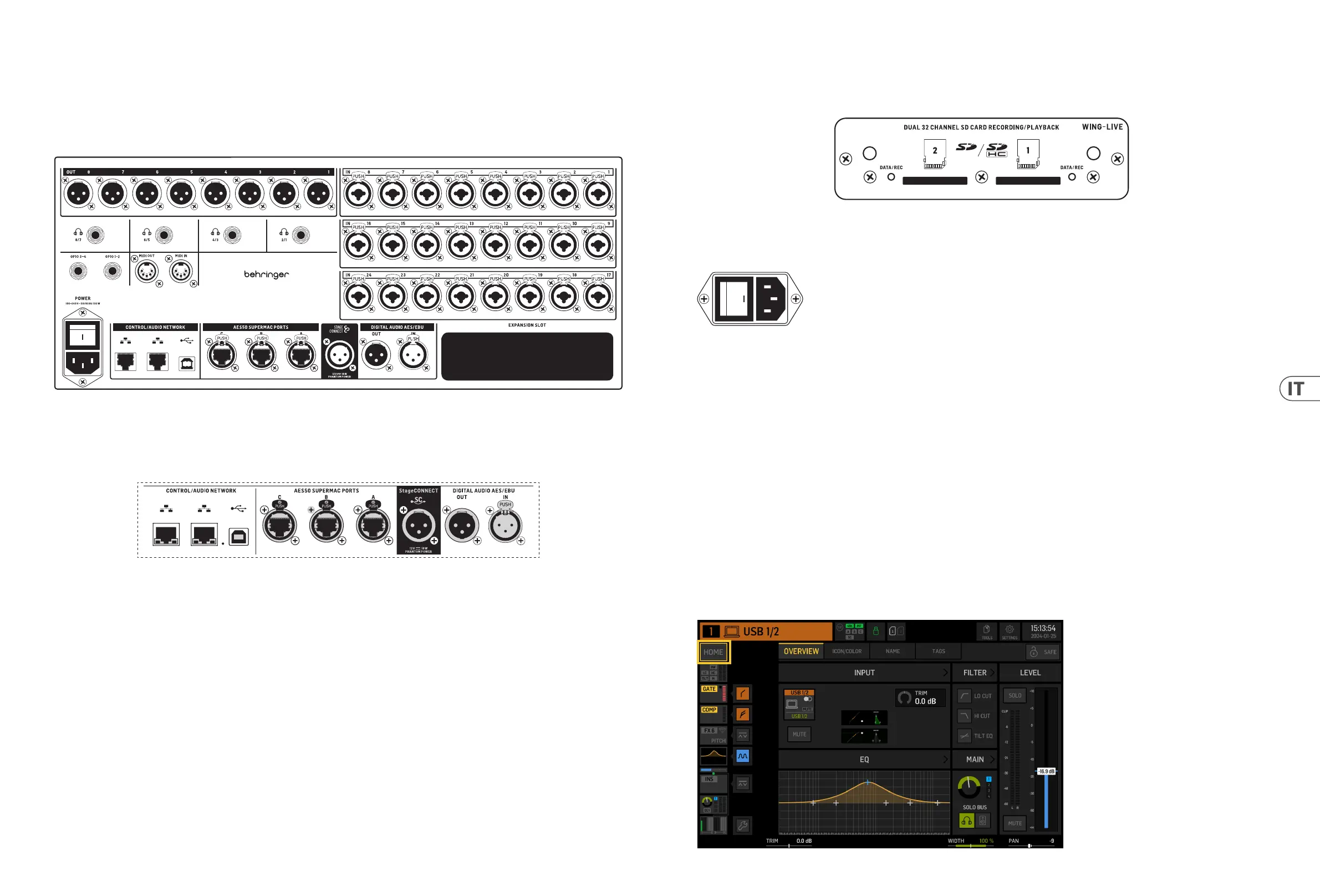 La console WING viene fornita con la scheda WING-LIVE installata, che consente di registrare no a 64 canali audio a 48 kHz / 32 bit su una coppia di schede SD o SDHC.
