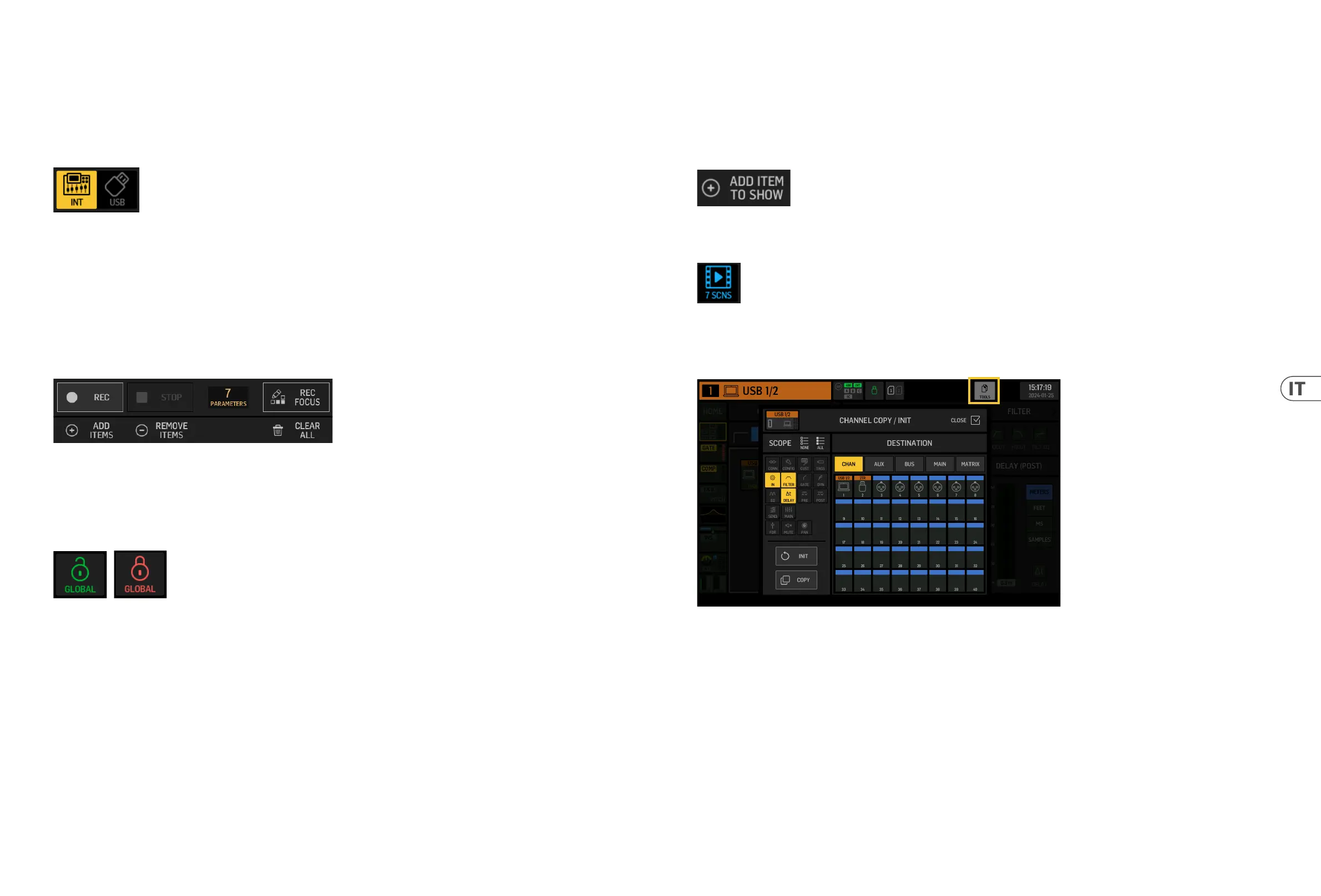 Gli snapshot, gli snippet, i clip, le congurazioni FX e le congurazioni dei canali possono essere raggruppati e salvati come Shows. Per farlo, vai alla scheda SHOW e