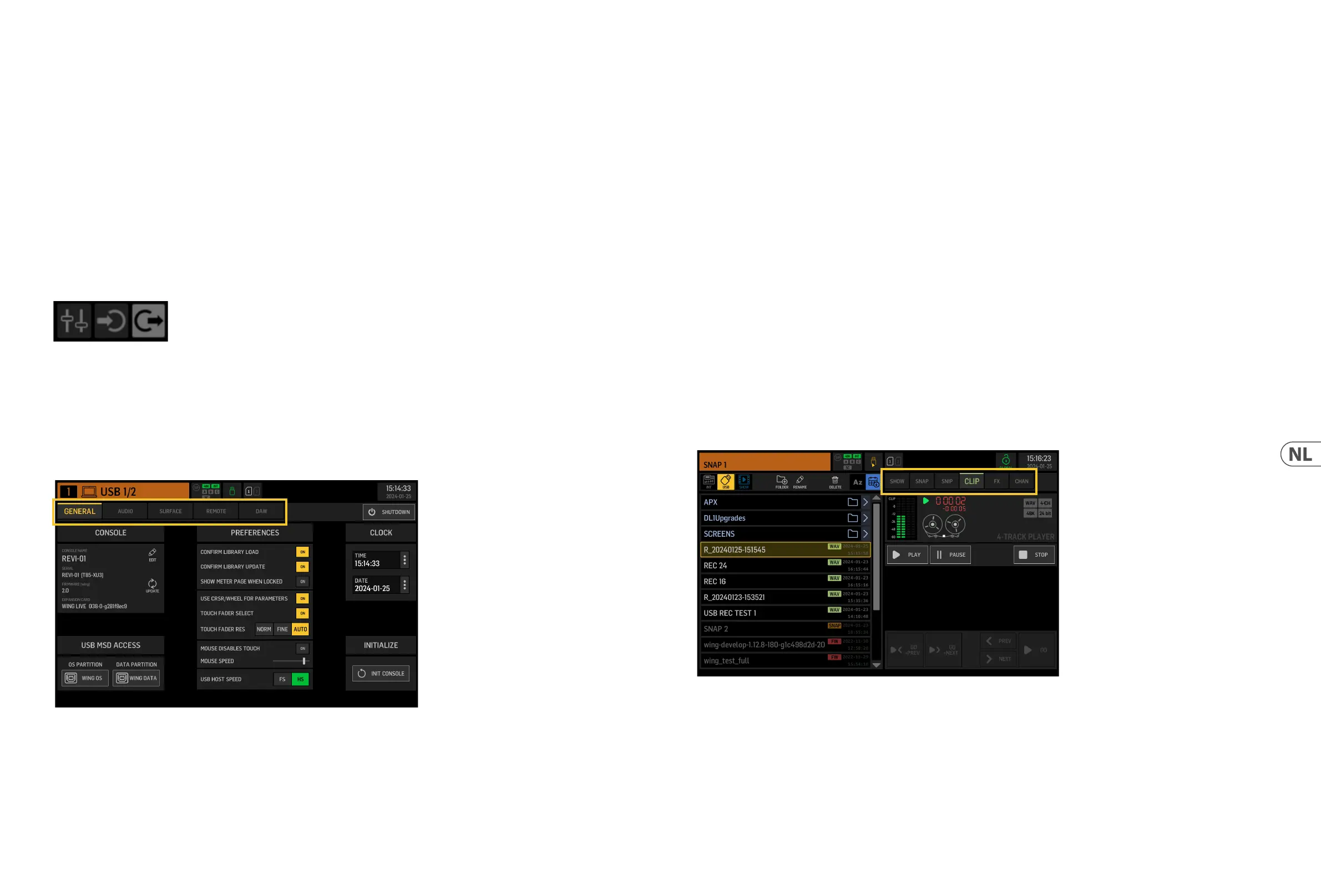 console te laden. Selecteer WING DATA om opgeslagen console-showgegevens te beheren (shows, snips, snaps, presets, clips). Om de console los te koppelen van de