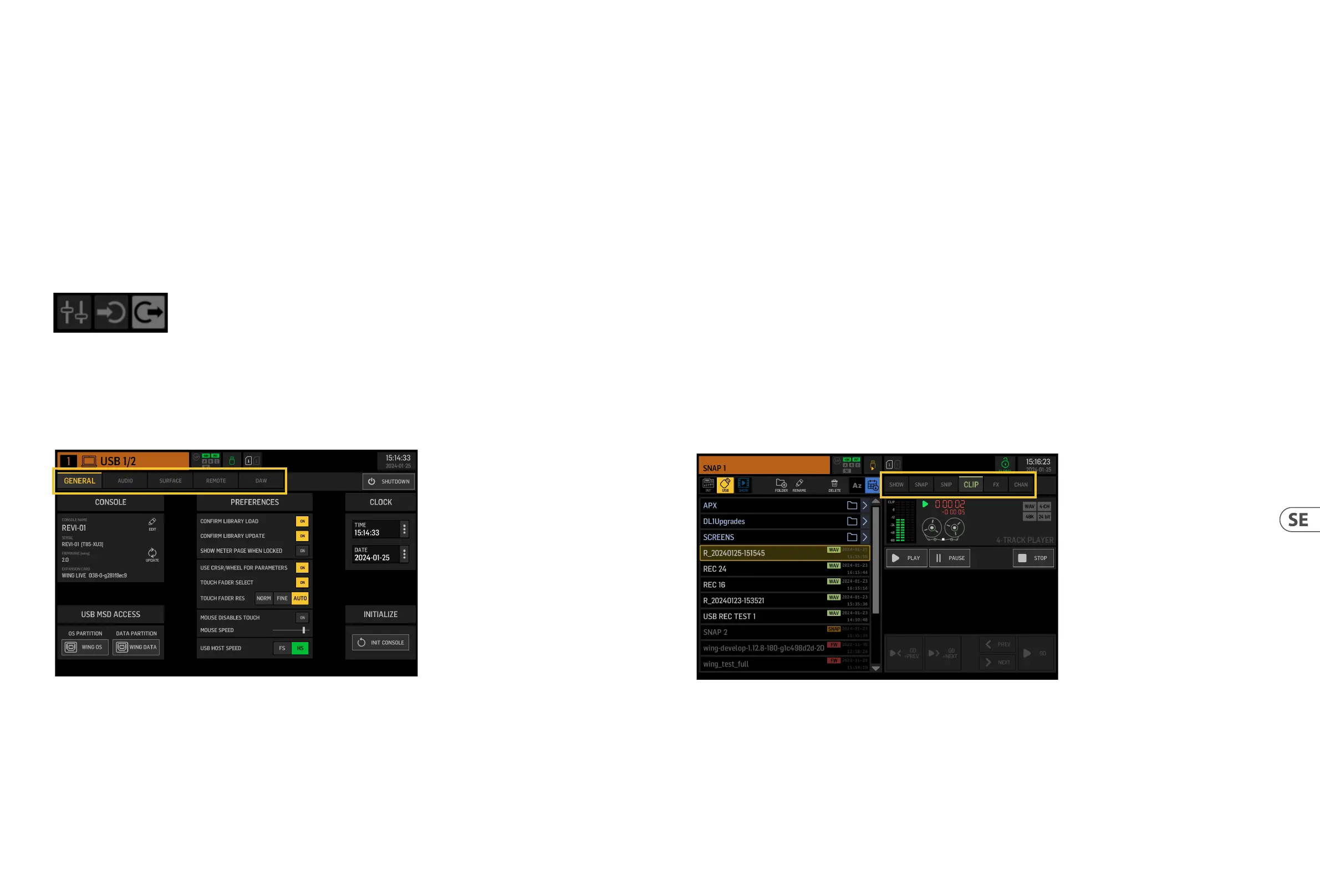 WING DATA för att hantera sparade konsolshowdata (shower, snips, snaps, förinställningar, klipp). För att koppla bort konsolen från datorn eller för att återgå till