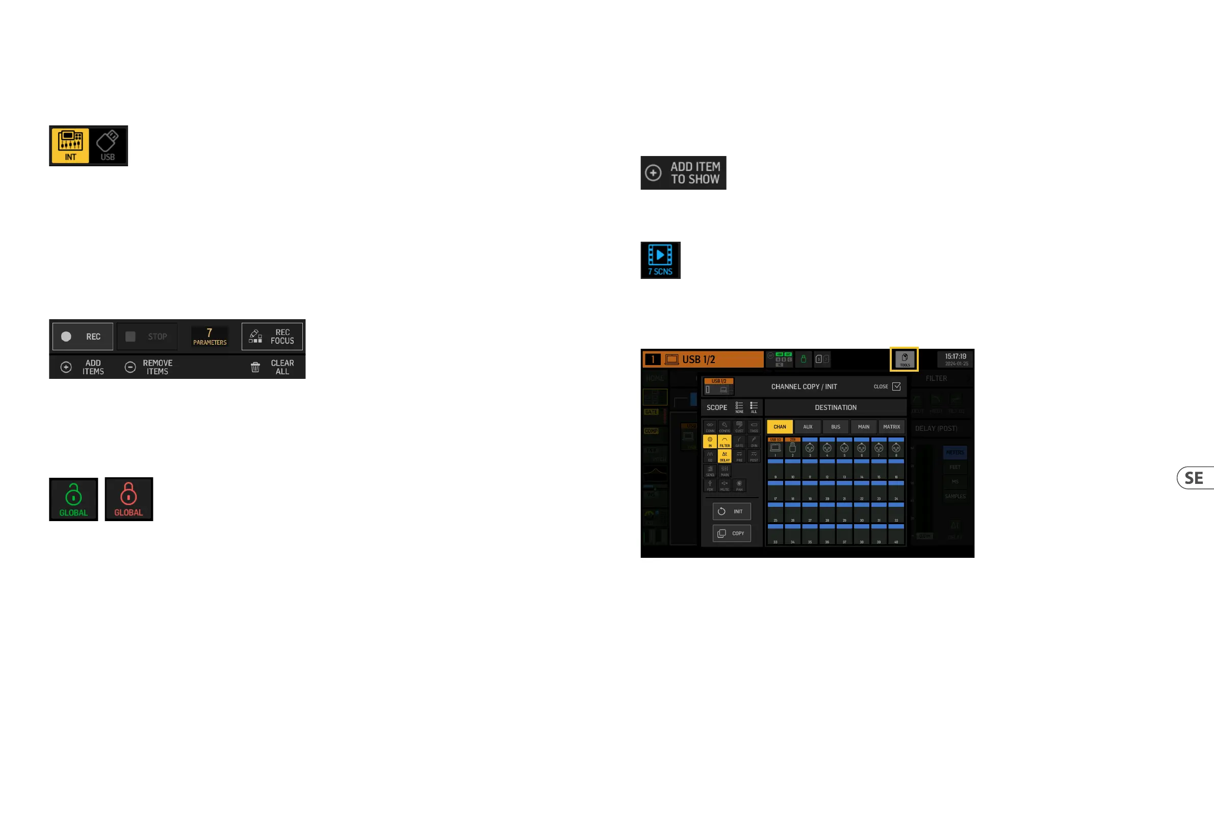 Snapshots, snippets, clips, FX-uppsättningar och kanaluppsättningar kan grupperas och sparas som Shows. För att göra detta, gå till SHOW-iken och klicka på