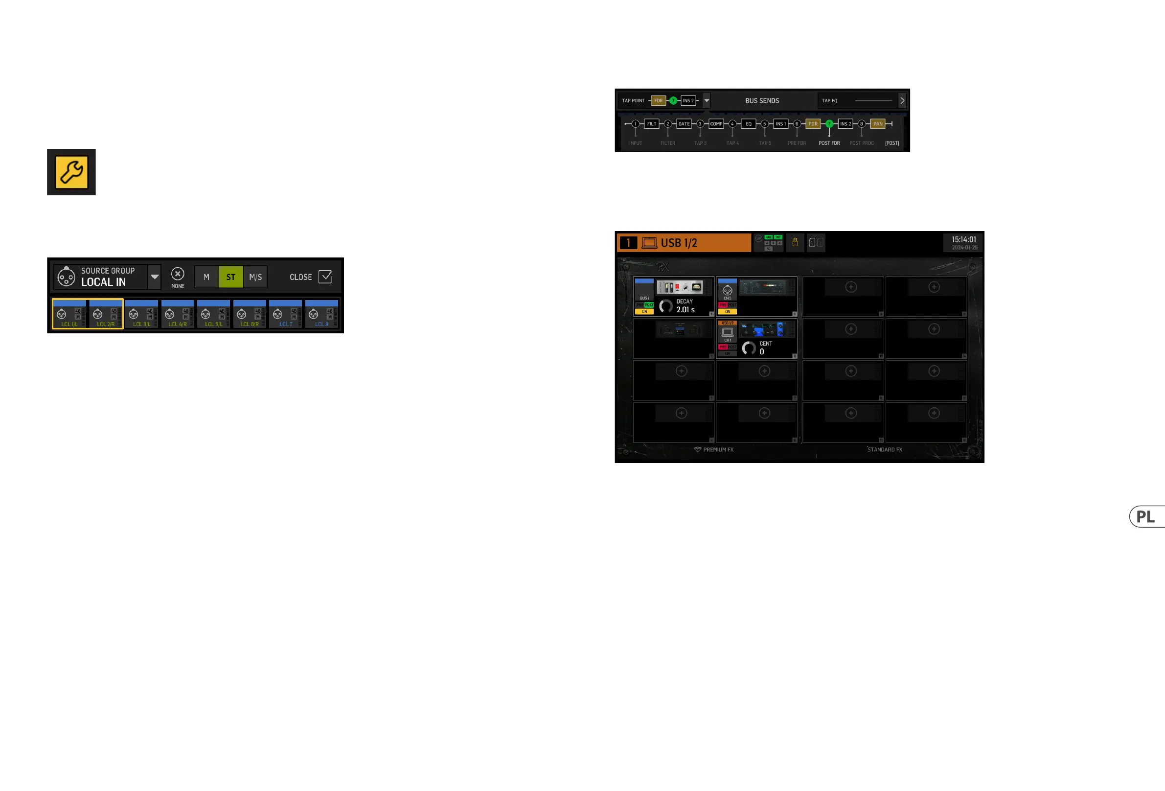 Tutaj wewnętrzne lub zewnętrzne efekty z jednego z 16 slotów FX mogą być wstawione do kanału. Może być umieszczony przed lub po blokach Gate, EQ i/lub