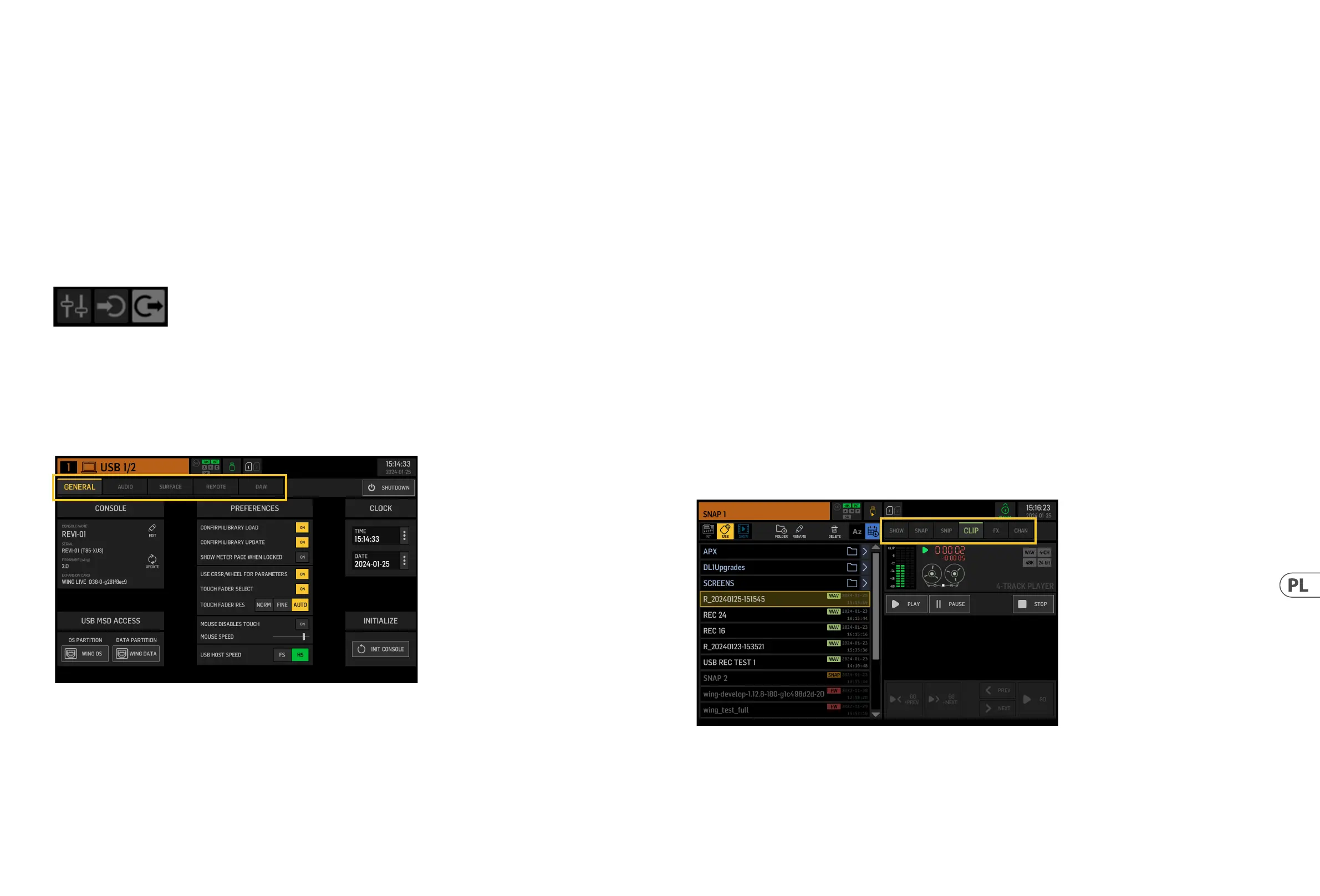 na konsoli. Wybierz WING DATA, aby zarządzać zapisanymi danymi pokazu konsoli (pokazy, wycinki, migawki, presety, klipy). Aby odłączyć konsolę od komputera lub