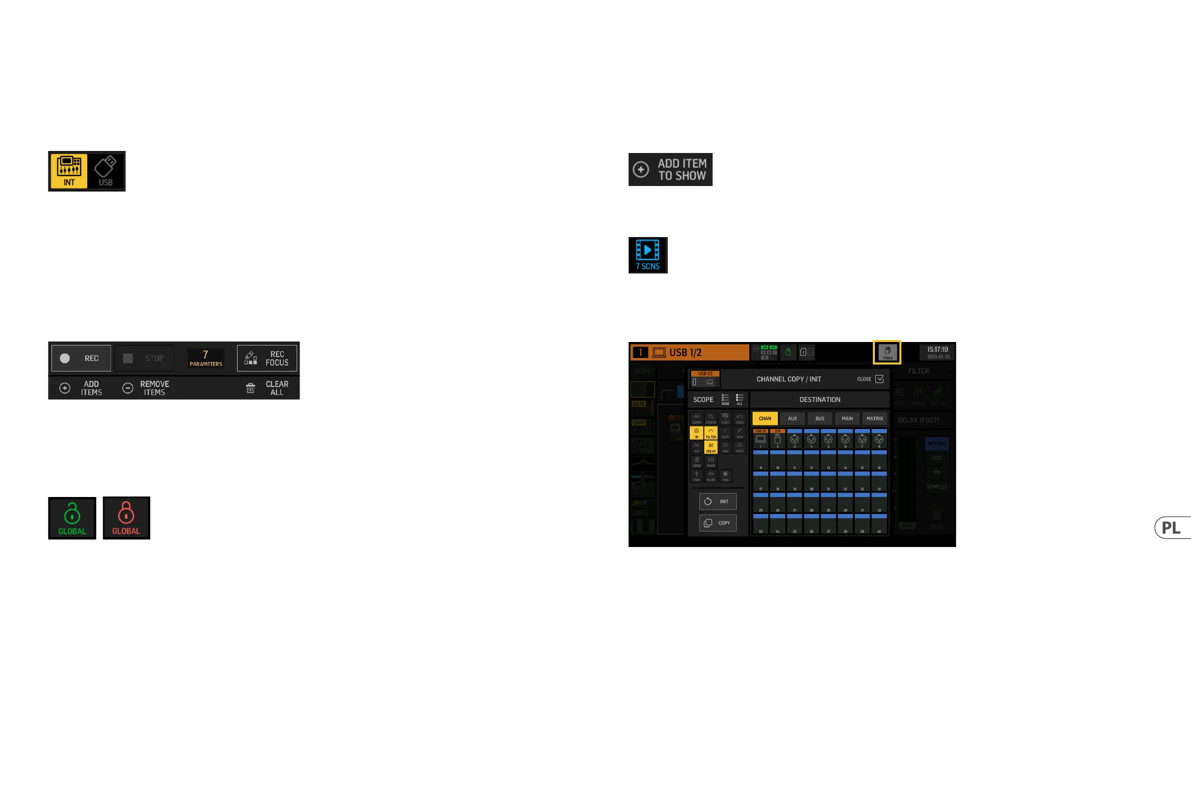 Migawki, fragmenty, klipy, ustawienia FX i ustawienia kanałów mogą być pogrupowane i zapisane jako Shows. Aby to zrobić, przejdź do zakładki SHOW i kliknij na