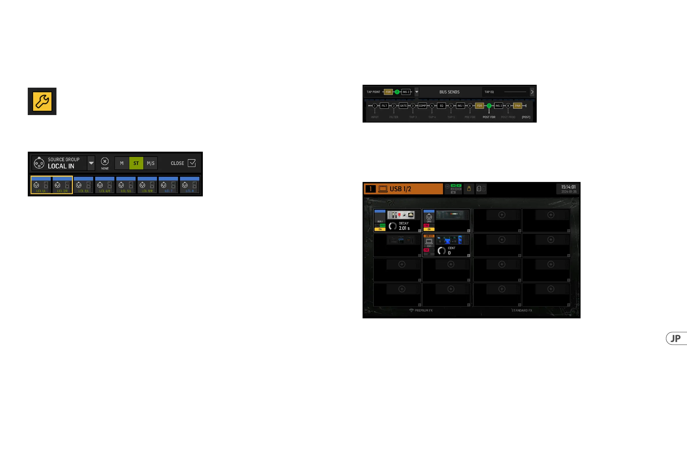 送 信 はプリフェーダー(タップポイント設 定による)または ポ ストフェーダー に設 定 できます。これらはモニタリングやエフェクト送 信に