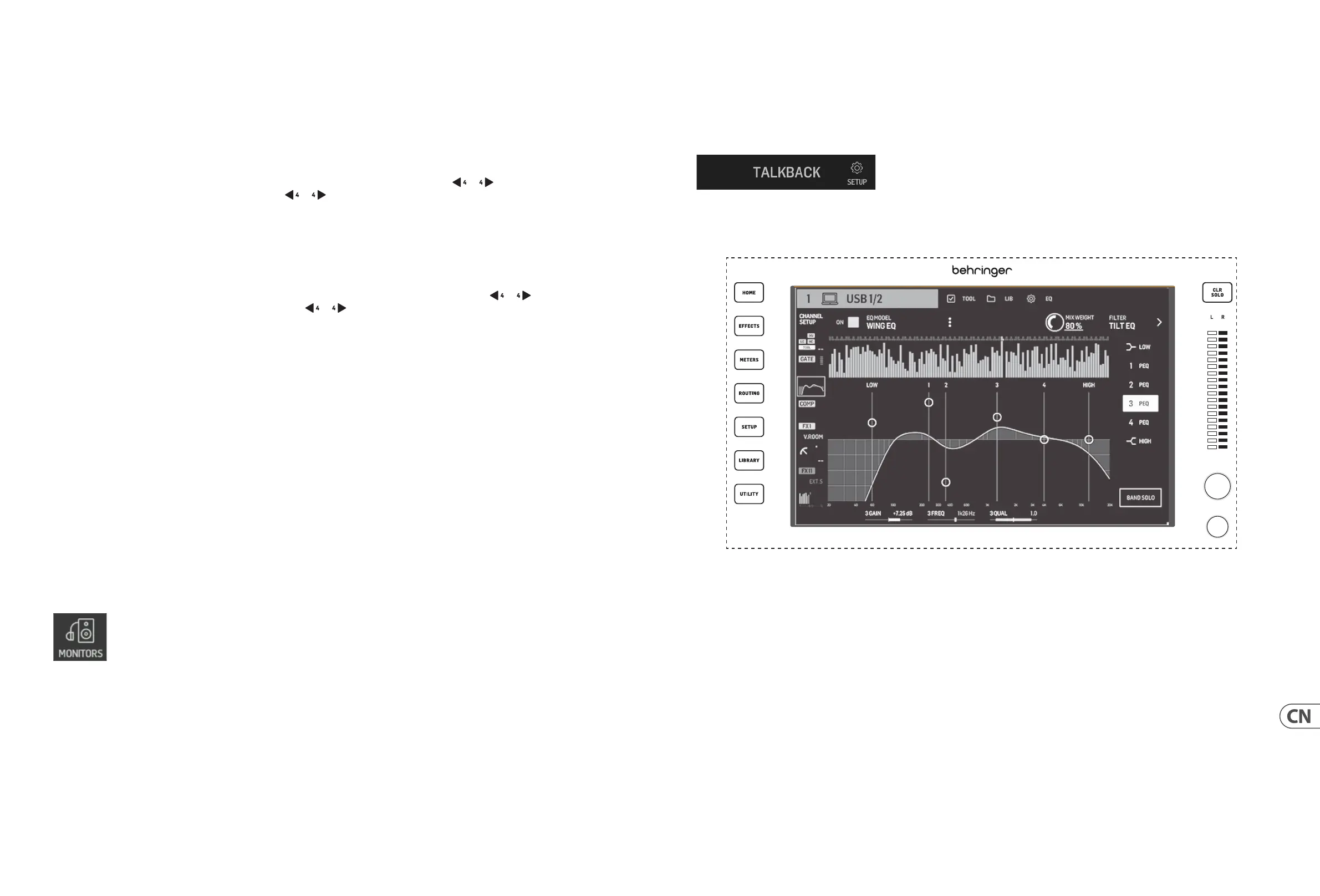 在 SETUP>MONITORS 页面上, 可以调整对讲麦克风级别, Dim 衰减和其他监视设置。 通过点击 TALKBACK>SETUP 按钮, 对讲信号可以发送到