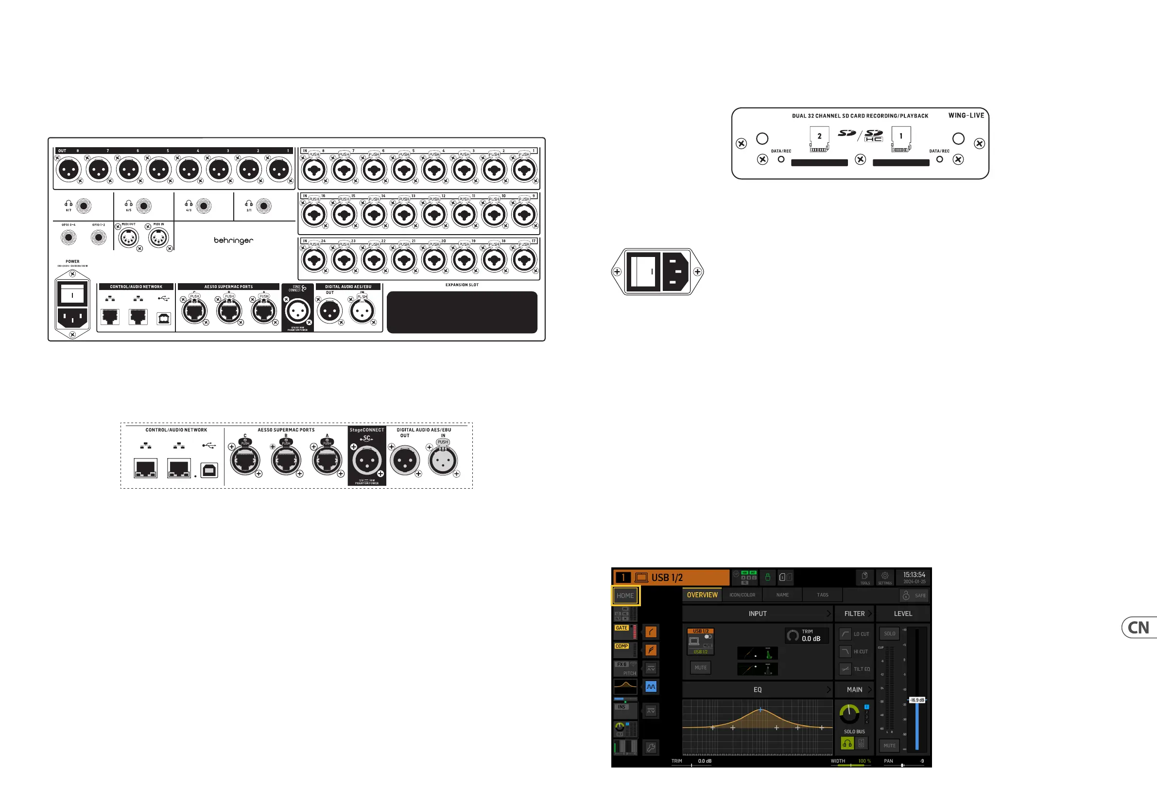 WING 控制台附带安装了 WING-LIVE 卡, 该卡允许将最多 64 个 48 kHz / 32 位音频通道录制到一对 SD 或 SDHC 卡上。 可以在此插槽中安装其他