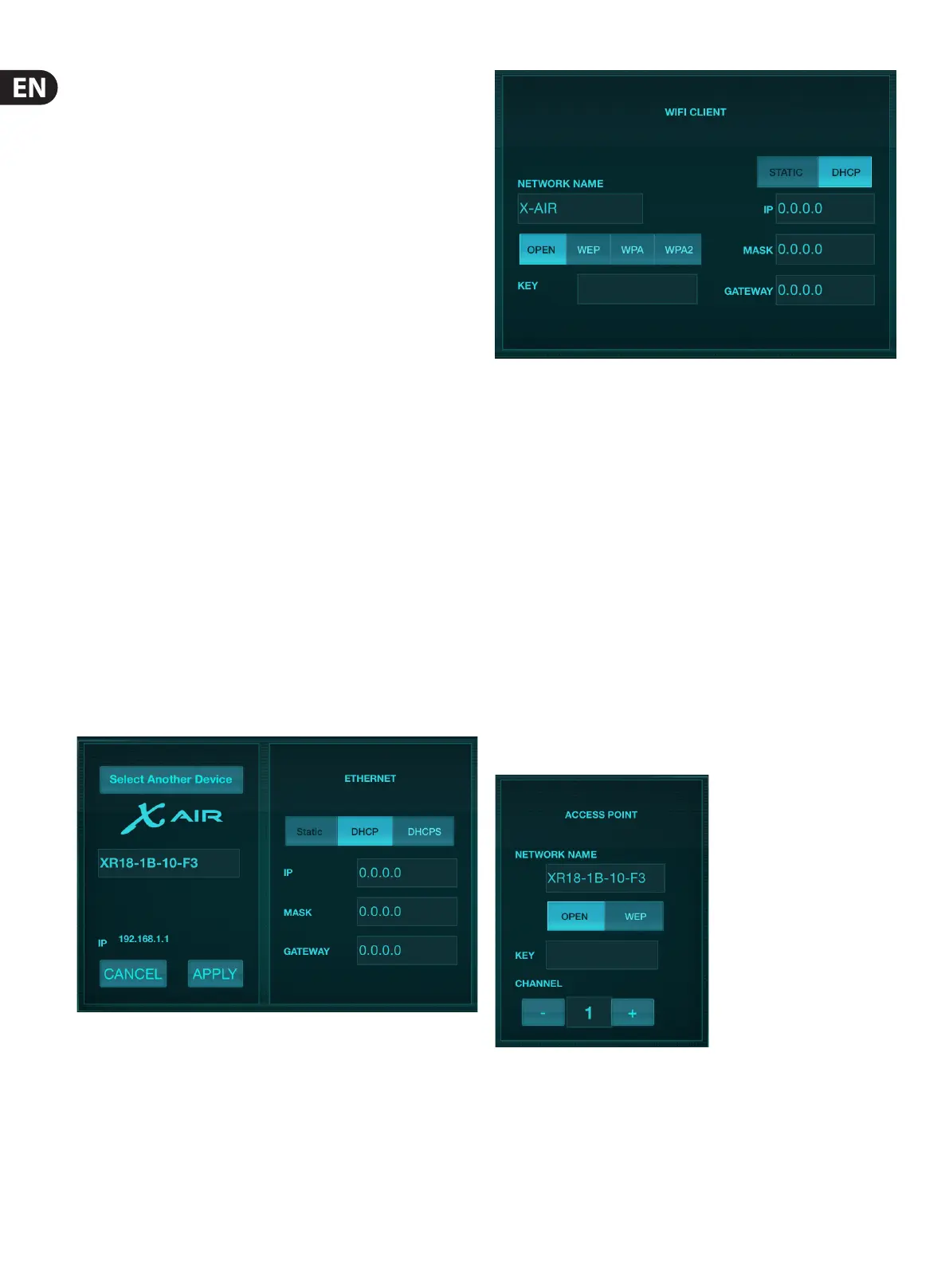 This mode supports DHCP Client (default) and xed IP operation. The X AIR mixers