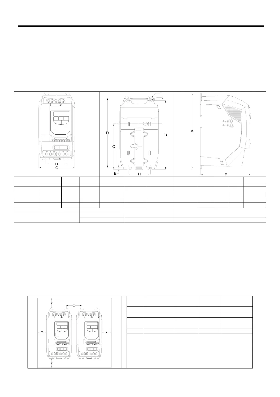 • Ensure the minimum air gap clearances around the drive as shown below are observed when mounting the drive.