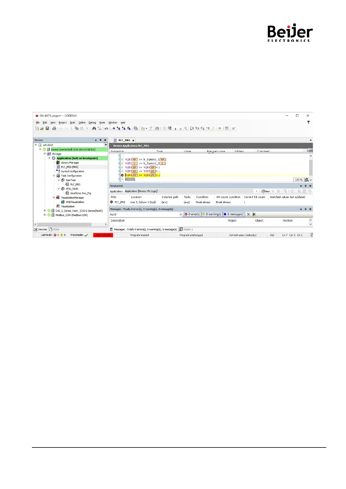 value of a specific variable changes. CODESYS supports breakpoints in all IEC editors. The halt at a breakpoint or data
