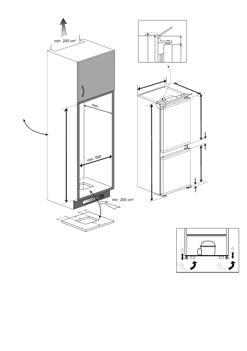 Sie können den Kühlschrank – wie in der Abbildung gezeigt – durch Drehen der Füße ausbalancieren. Wenn Sie in Richtung des schwarzen Pfeils