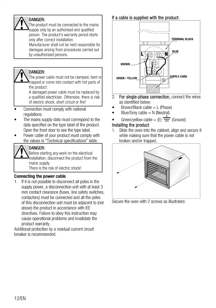 Beko BIM15100B - Power Cable Connection; Oven Installation
