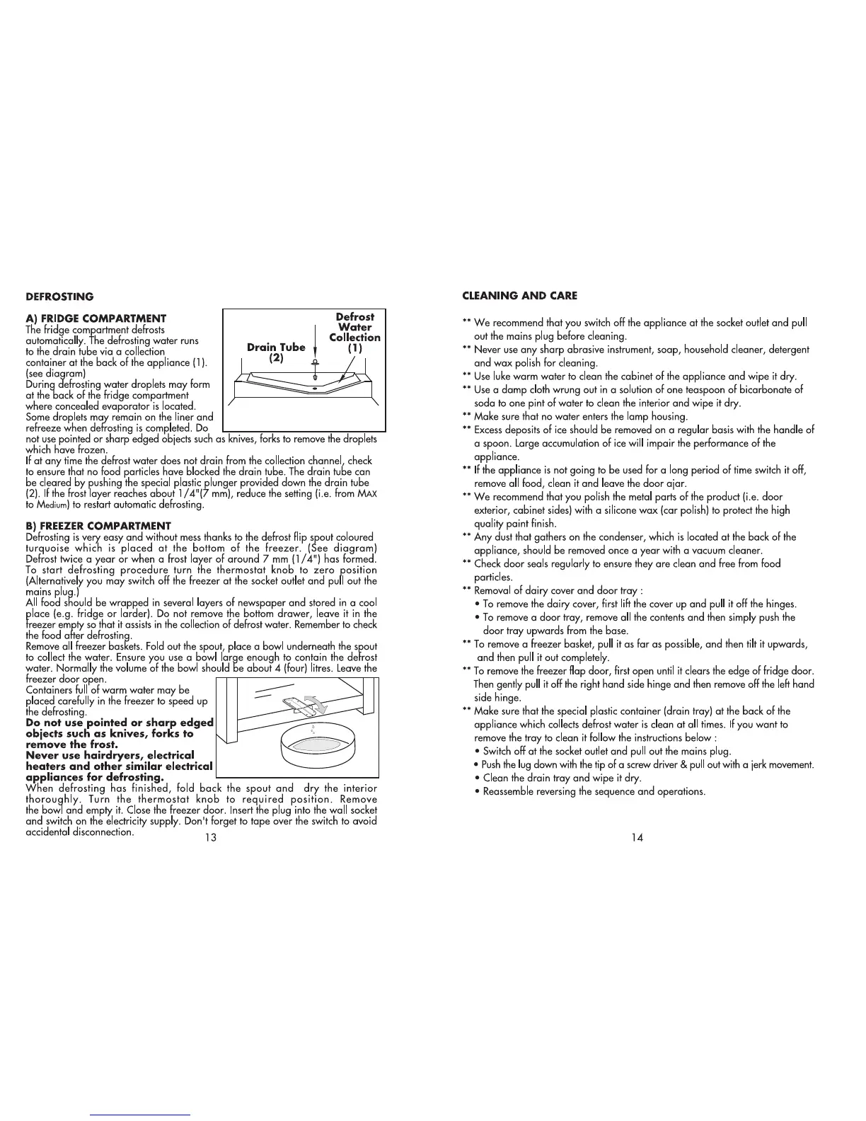 Beko CSA576 - Defrosting; Fridge Compartment; Freezer Compartment; Cleaning and Care