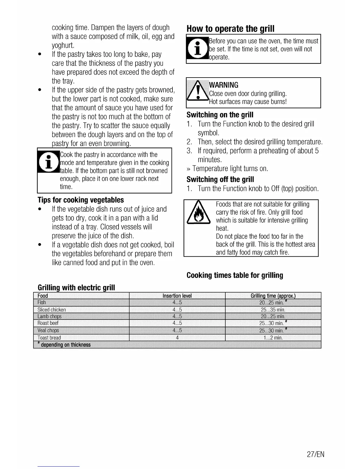 Beko CSM 62320 D - How to Operate the Grill; Cooking Times Table for Grilling