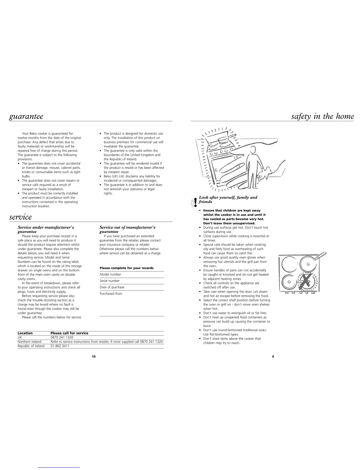 Beko DC3511 - Guarantee and Service; Service Under Manufacturers Guarantee; Service Out of Manufacturers Guarantee; Safety in the Home