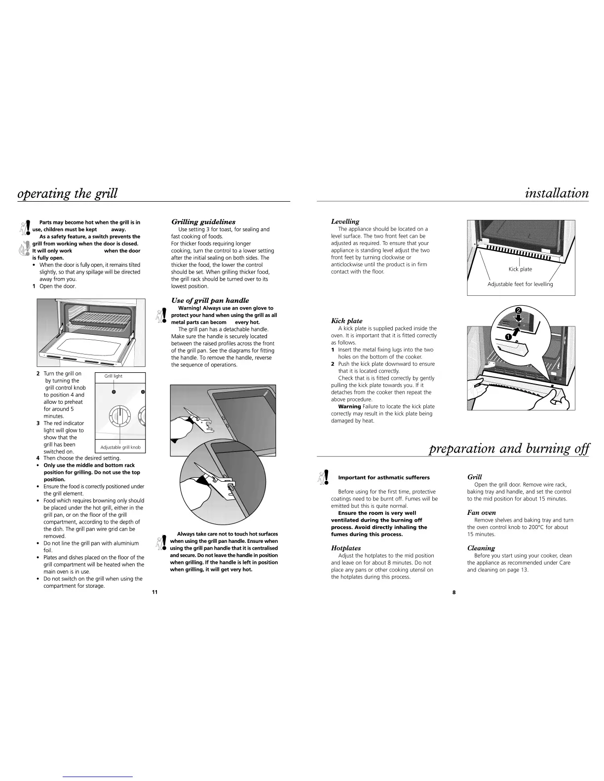 Beko DCC4521 - Operating the Grill; Grill Safety and Controls; Grill Pan Handle Usage; Installation and Levelling