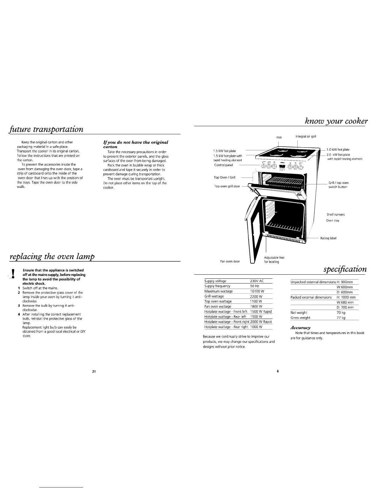 Beko DV655 - Know Your Cooker; Technical Specifications; Cooker Transportation; Replacing the Oven Lamp