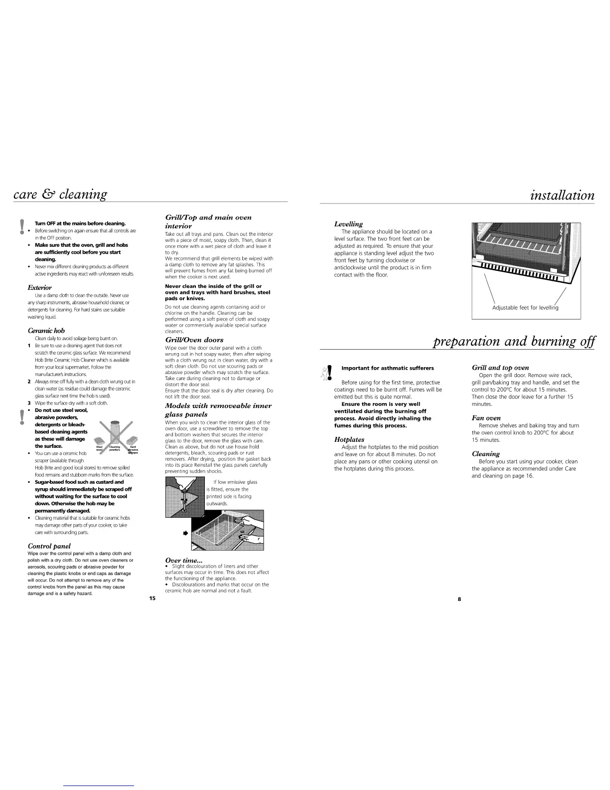 Beko DVC62 - Care & Cleaning; Installation; Preparation and Burning off; Levelling
