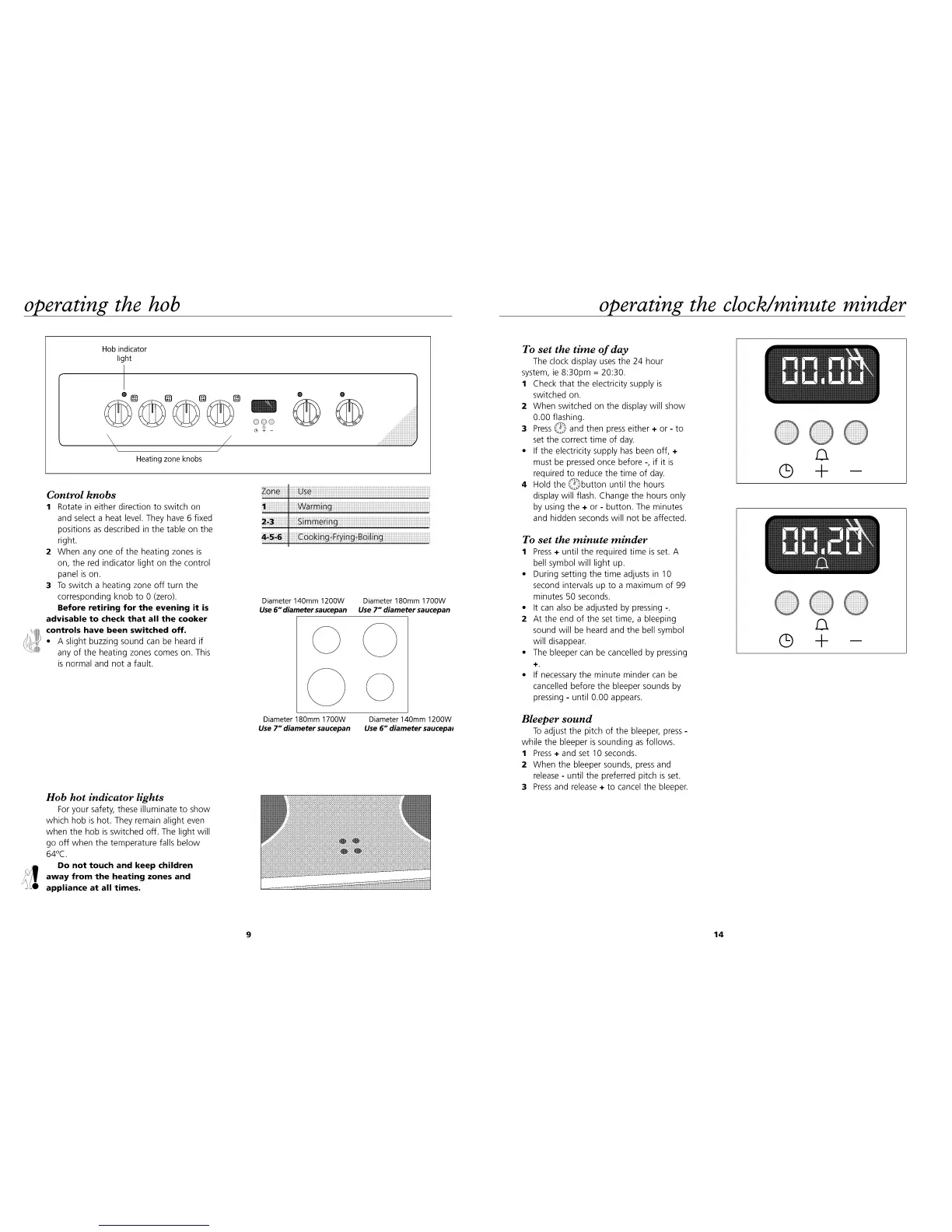 Beko DVC62 - Operating the Hob; Operating the Clock;Minute Minder; Control Knobs; Hob Hot Indicator Lights