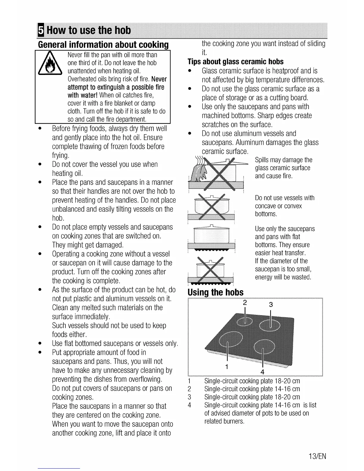 Beko HIC 64400 E - How to use the hob; General information about cooking; Tips about glass ceramic hobs; Using the hobs
