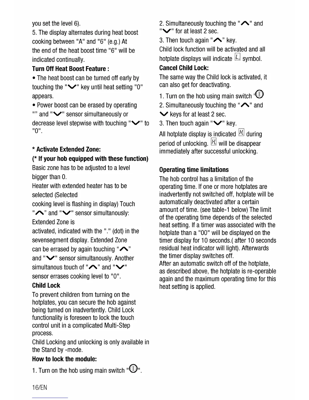 Beko HIC 64400 E - Child Lock; Operating time limitations