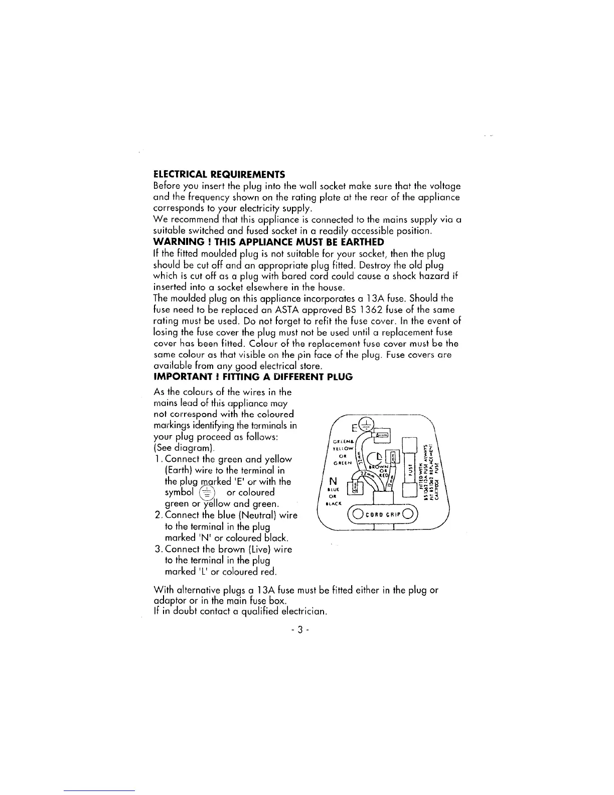 Beko MC112 - Electrical Requirements; Fitting a Different Plug