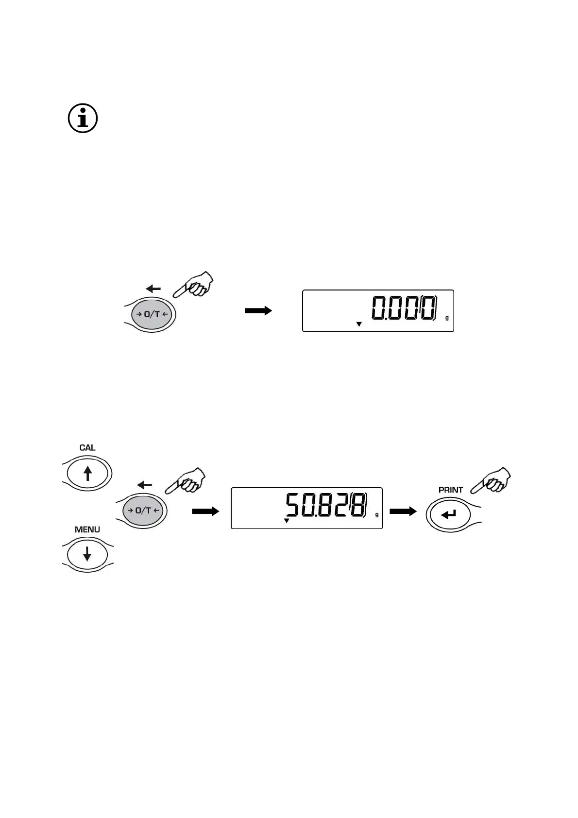 1. Press and keep pressed the O/T key whit no objects on the weighing pan until the