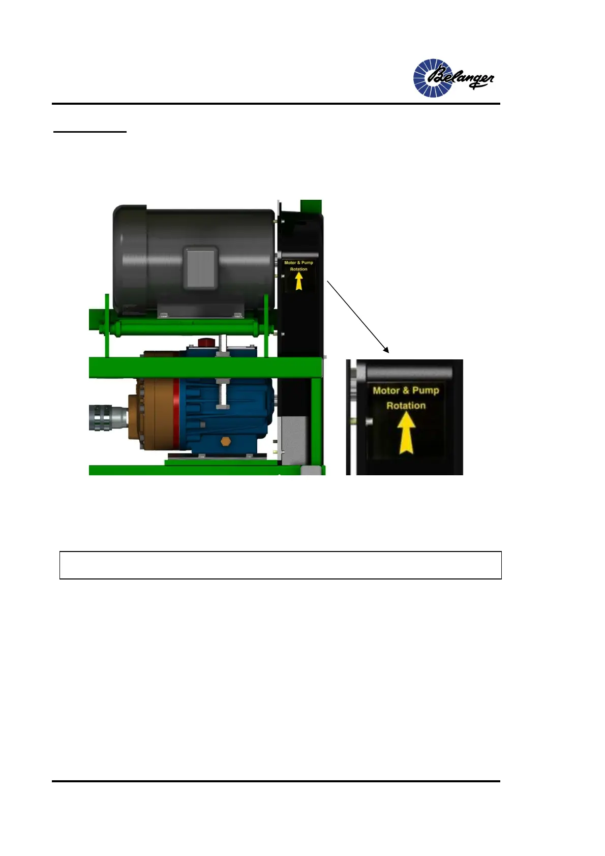 Verify the proper motor and pump rotation according to the decal on the plastic belt guard. See the image