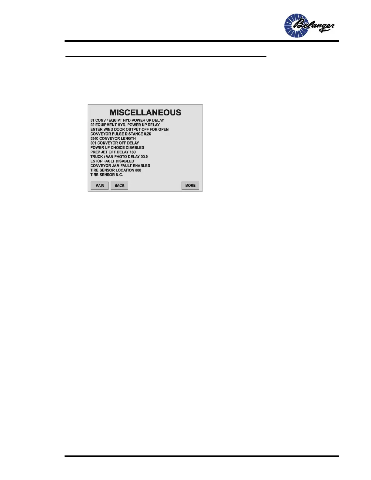 • Conveyor / Equipment Hydraulic Power Up Delay: Displays the seconds required for the Main Hydraulic