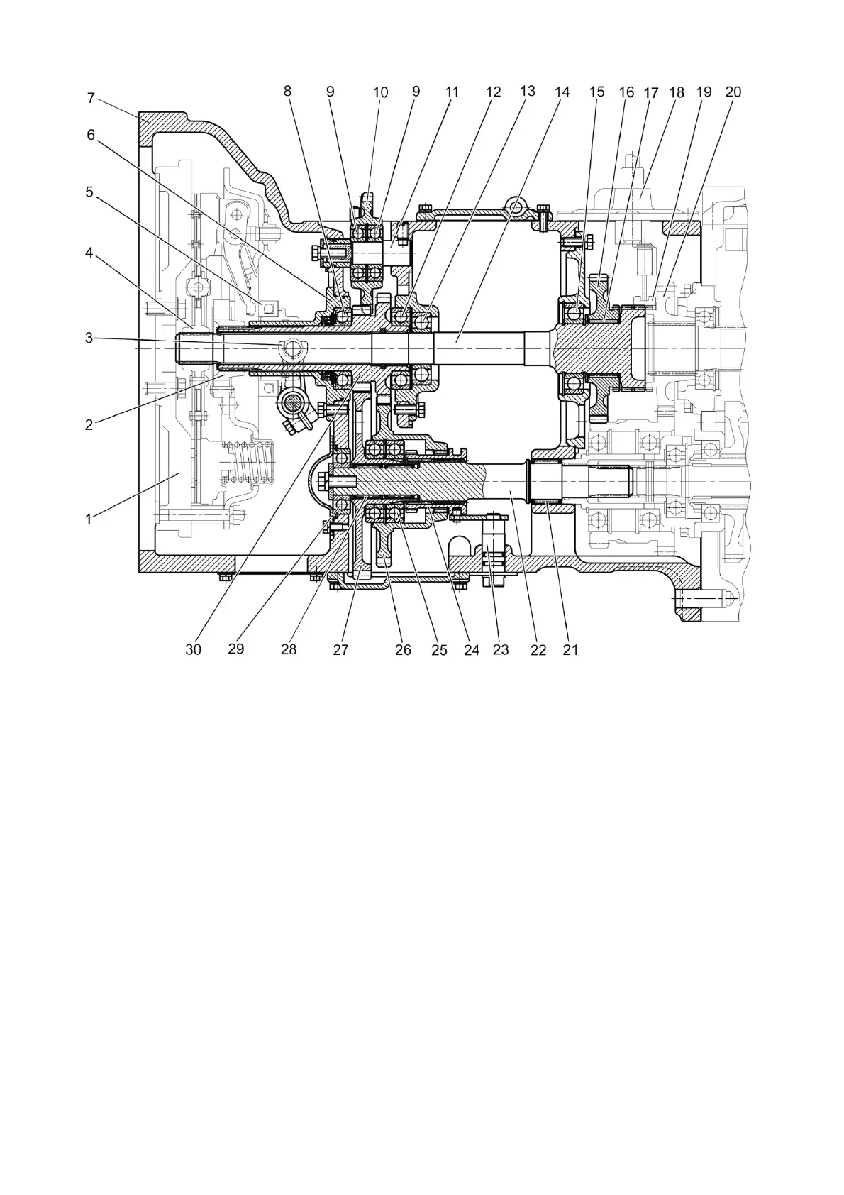 bracket; 7 – clutch casing; 8, 9, 12, 13, 15, 25, 29 – bearing; 10 – gear of the HLL pump drive;