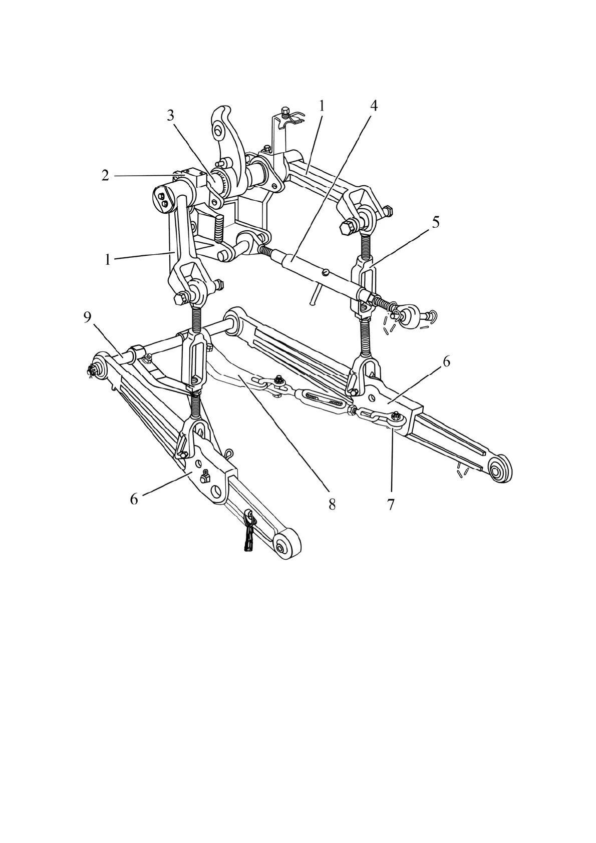 rear axle case. Levers 1 are connected to lower links 6 by means of braces 5.