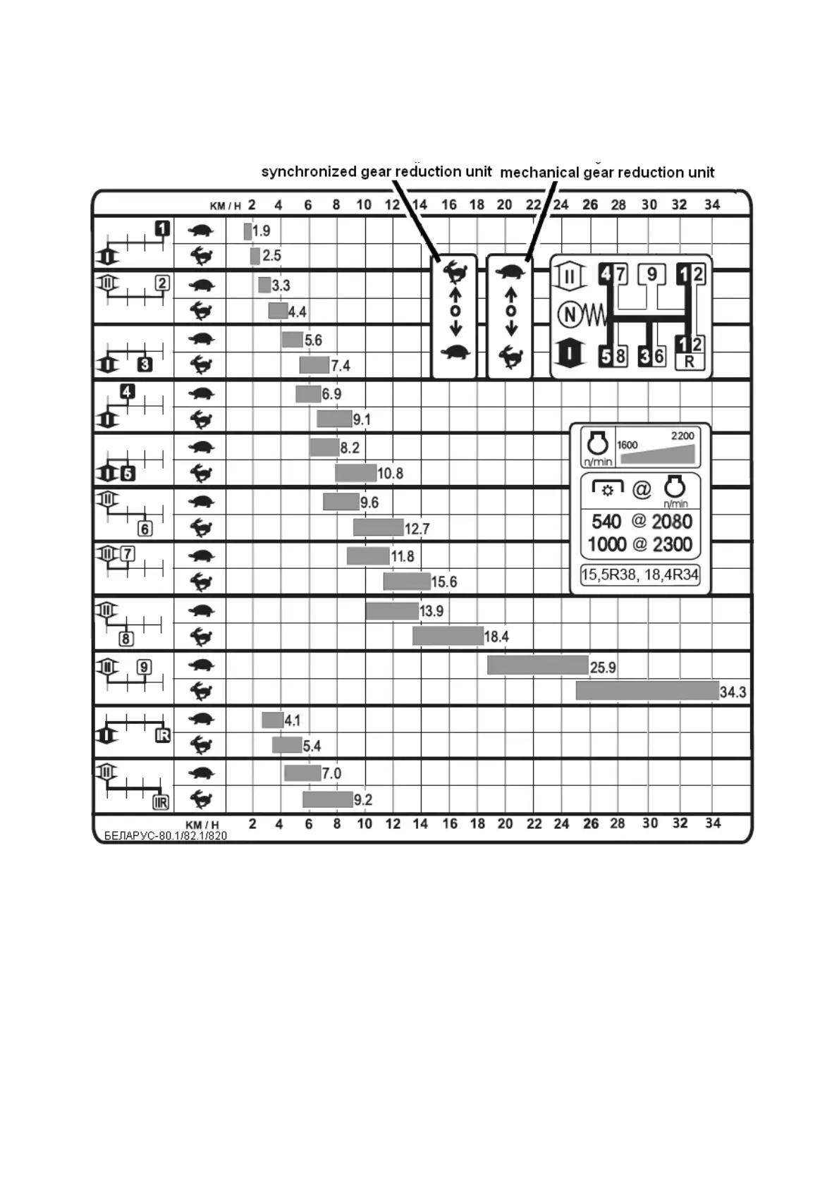 The velocity diagram table of tractor “BELARUS080.1/82.1/820” on tyres of basic