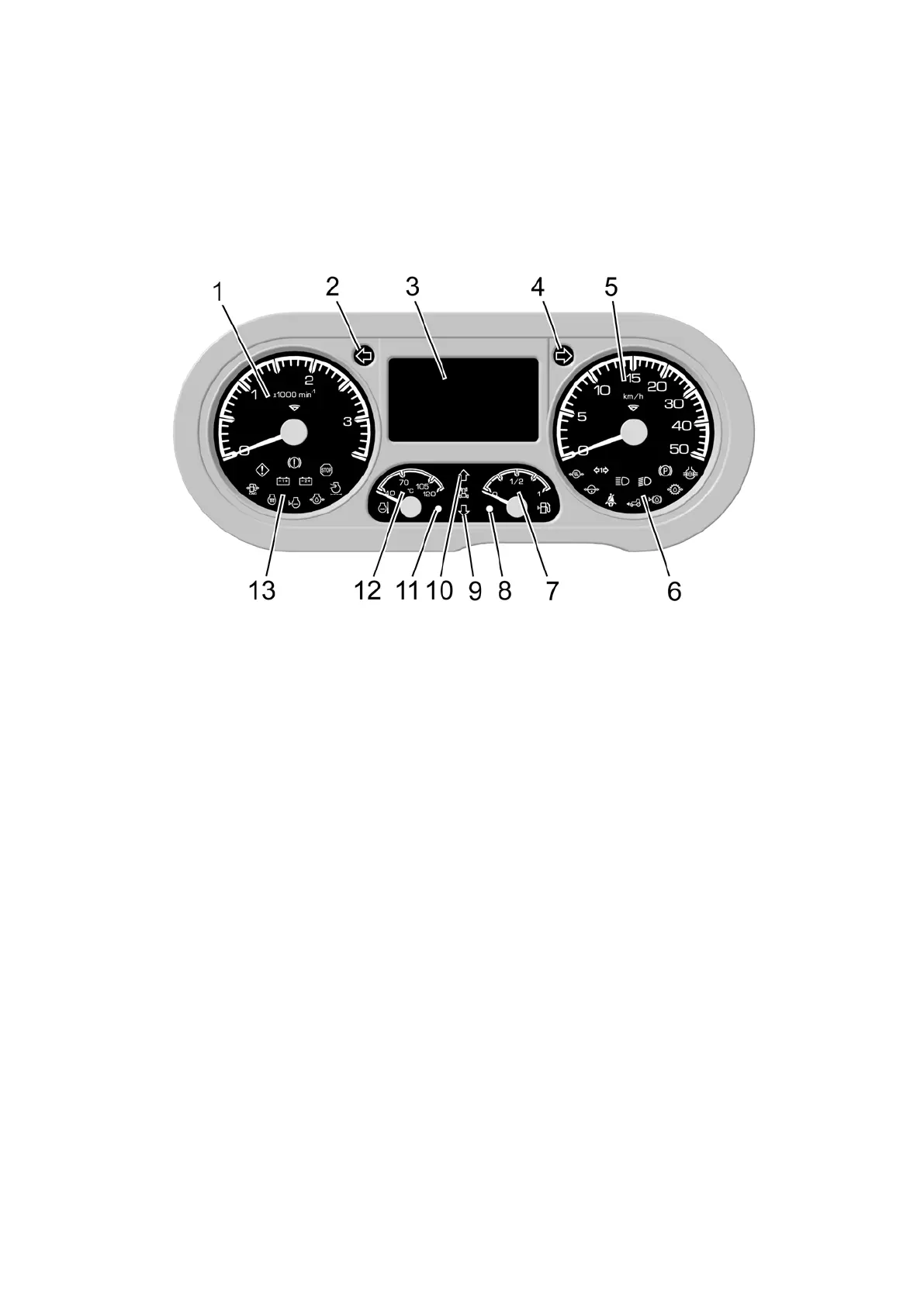 coolant temperature; 13 – annunciators built in the crankshaft speed gauge.