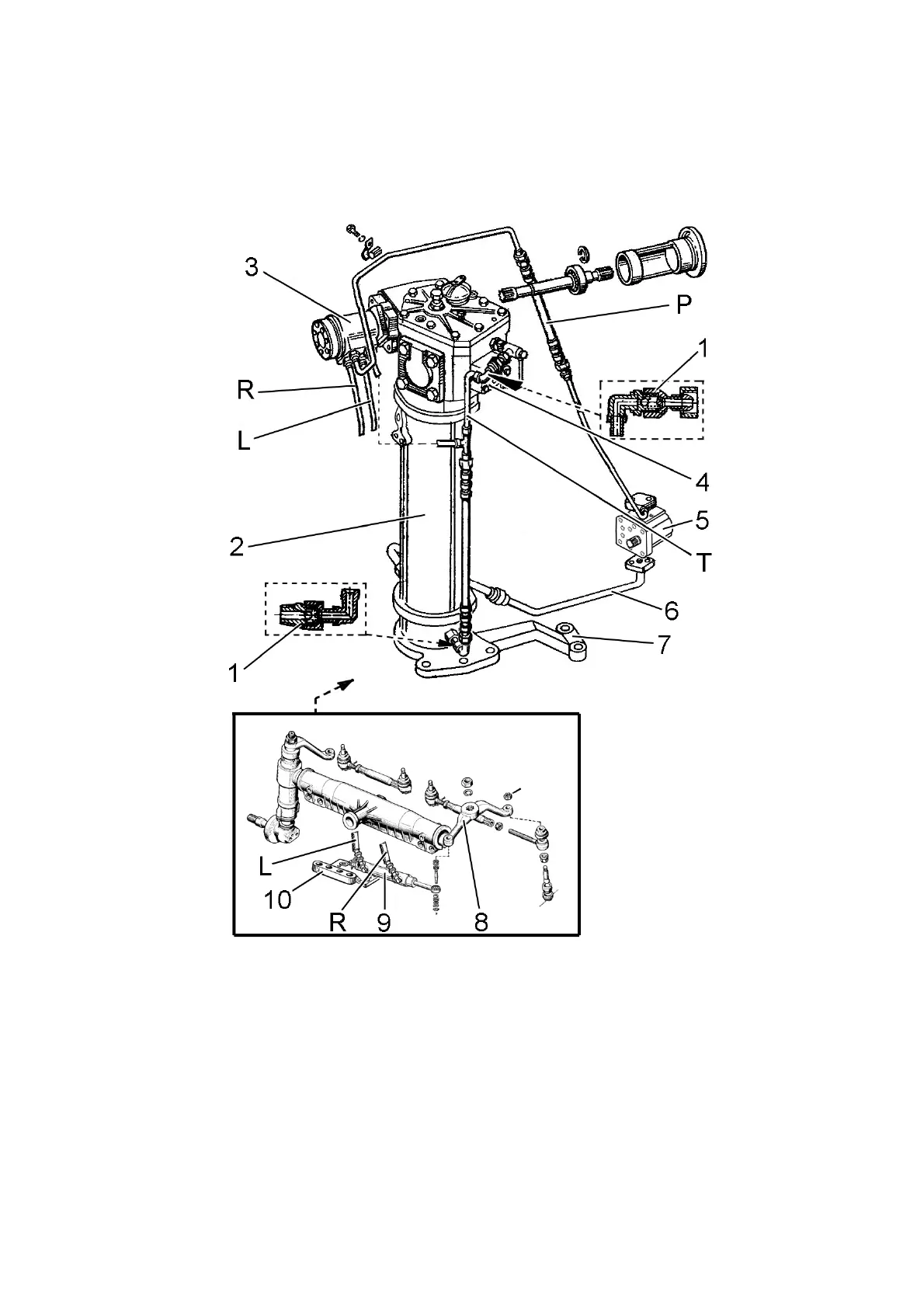 Т – drain hydraulic line; L – left turn hydraulic line; R – right turn hydraulic line.